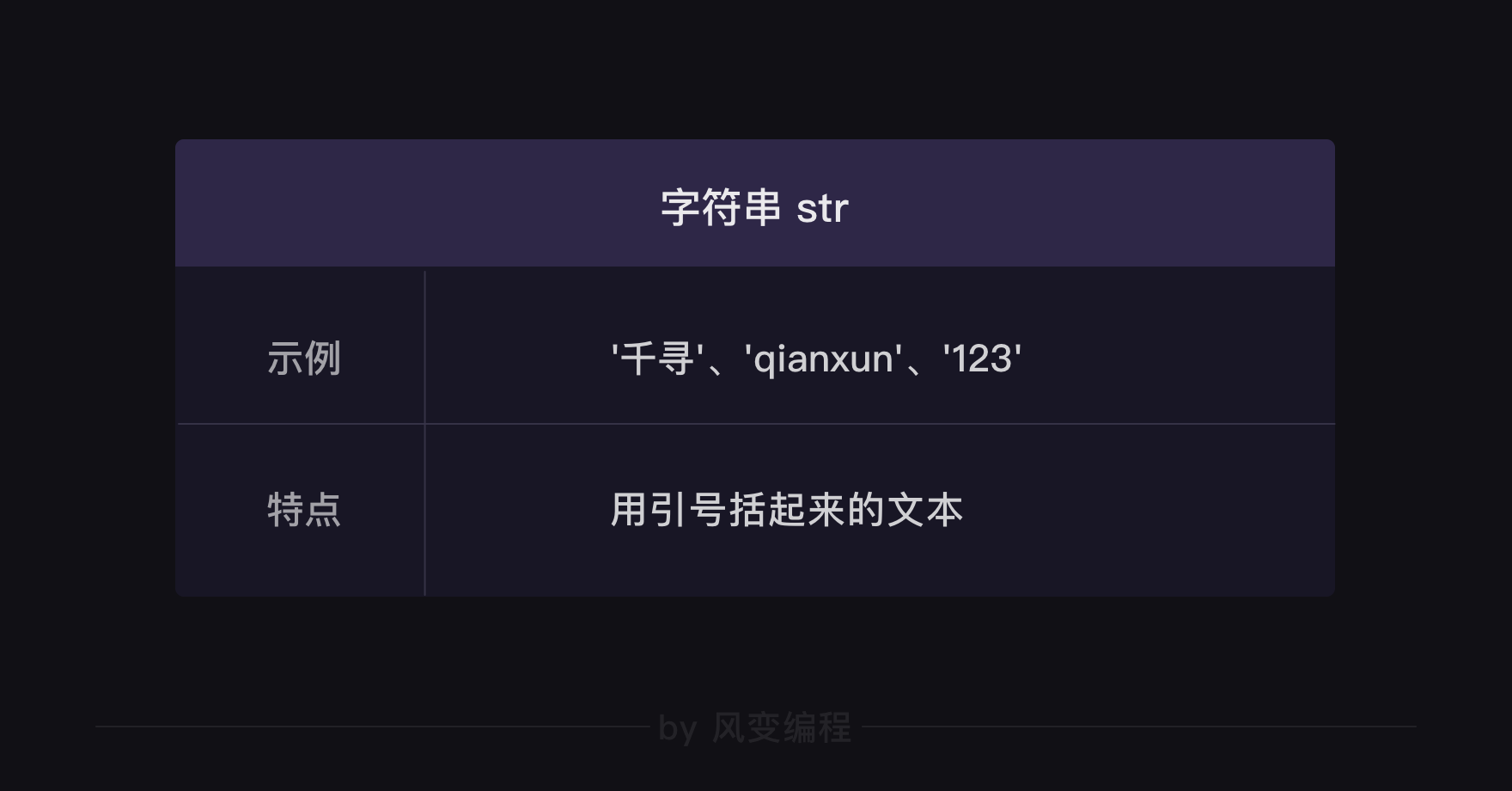 字符串英文string,简写str 字符串的识别方式非常简单——有层名为【引号】的皮,只要是被【单/双/三引号】这层皮括起来的内容,不论那个内容是中文、英文、数字甚至火星文。只要是被括起来的,就表示是字符串类型。