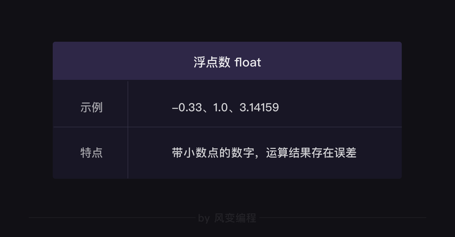 浮点数非常好识别,它比整数多了一个小数点『.』浮点数的英文名是float,与整数(int)和字符串(str)不同,浮点数没有简写。