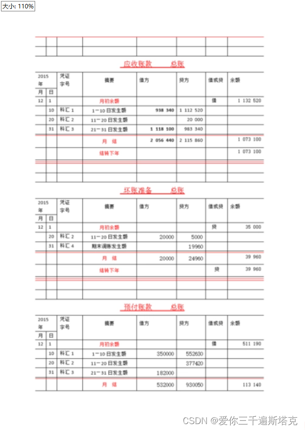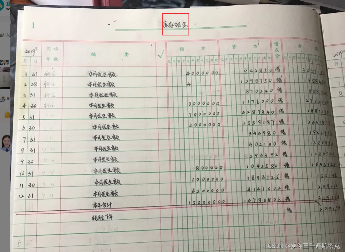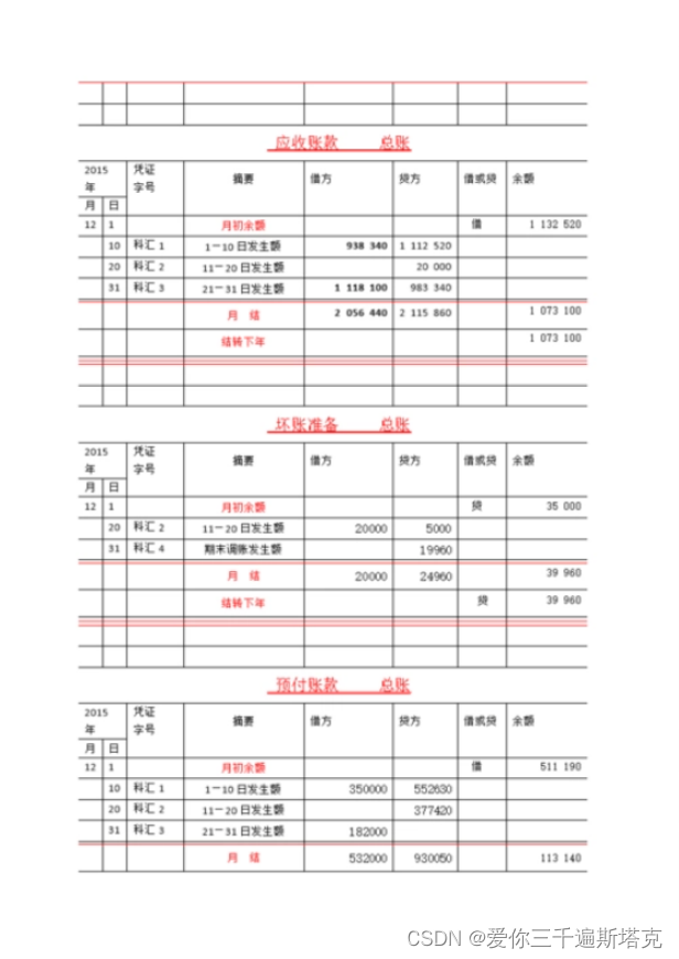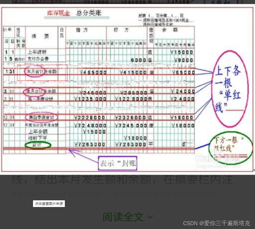 2、结帐时,应当结出每个帐户的期末余额。需要结出当月发生额的,应当在摘要栏内注明“本月合计”字样,并在下面通栏划单红线。需要结出本年累计发生额的,应当在摘要栏内注明“本年累计”字样,并在下面通栏划单红线;12月末的“本年累计”就是全年累计发生额。全年累计发生额下面应当通栏划双红线。年度终了结帐时,所有总帐帐户都应当结出全年发生额和年末余额。