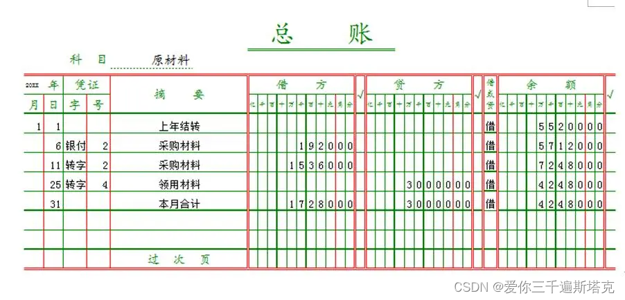 总分类账的格式是三栏式,设有借方、贷方和余额三个金额栏目。