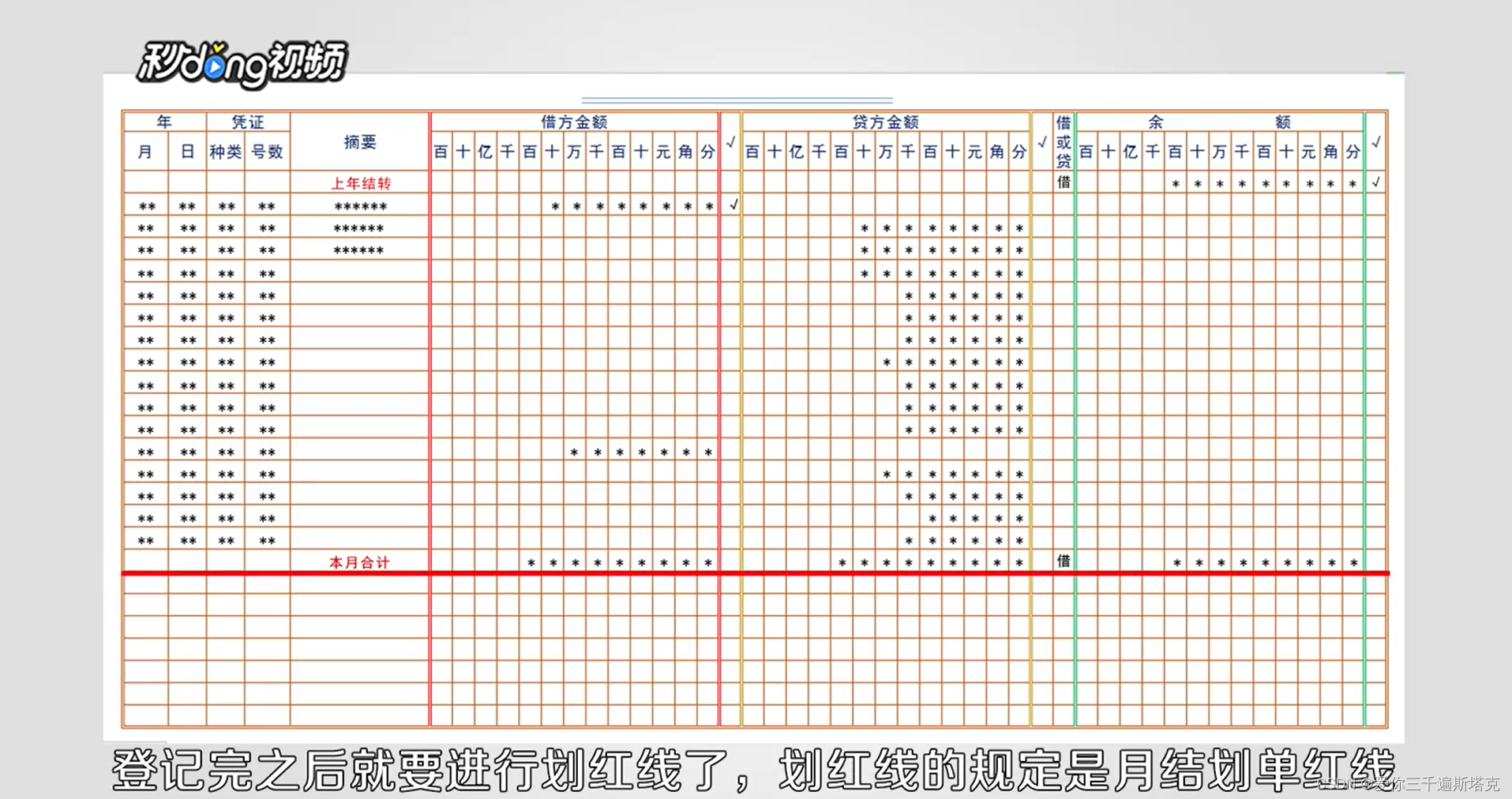 3、登记完之后划红线,划红线的规定是月结划单红线,年结或者季度一结划双红线。如此即可将明细账登记完成。