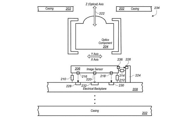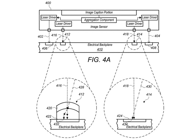 对于采用霍尔效应传感器的相机模块来说,电子讯号数量也是一个问题。霍尔效应传感器用来确定内部组件的位置,例如在光学防手震系统中镜头相对于成像传感器的相对位置。由于这些都要求一个移动的磁场,它们的位置可能位于安装在一个致动器上的磁铁附近,这进一步限制了霍尔效应传感器的位置。美国专利和商标局当地时间星期四披露的一件专利申请文件,表明苹果在探索利用多个光学模块,使成像传感器把数据传输给一个与手机其他硬件相连的专用组件。成像传感器中可以嵌入一个或多个光线发射模块,专用组件中有光线接收传感器。为了实现更高的数据传输速率,多个光线发射模块和接收传感器可以并行工作。