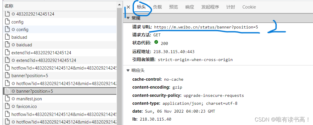 4. 到了这里我们已经找到我们要的数据在哪里了,那么接下来需要对这个文件进行爬取,然后在进一步解析出里面的评论。首先我们点击标头——>在标头里找到请求URL,那就是我们要爬取的链接——>将其复制到代码里,别忘了把cookie和浏览器的user-agent(如果这个文件没有就换下面几个文件,都一样的)。