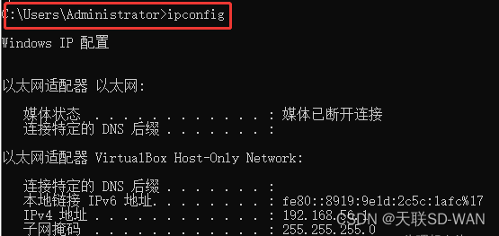 1:ipconfig 当使用该命令不带任何参数时,它为每个已经配置了的接口显示IP地址,子网掩码和默认网关值。