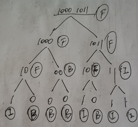 };char getid(string s) { //判断字符串的类型(用string类的find函数很方便)if (s.find('0') == s.npos) return 'I';else if (s.find('1') == s.npos) return 'B';return 'F';