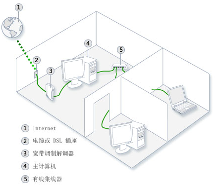 首先,需要一台计算机(称为主机),该计算机与 Internet 连接并且单独连接到网络中的其他计算机。您将对 Internet 连接启用 ICS。然后网络中的其他计算机会连接到主机,并通过主机的共享 Internet 连接与 Internet 连接。原理图如上图所示。