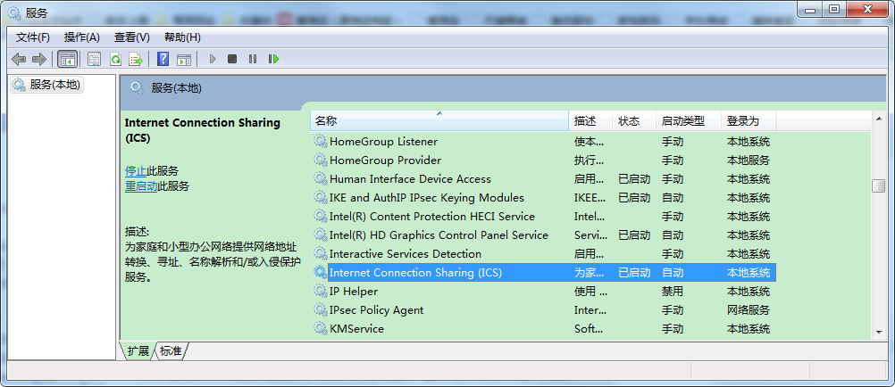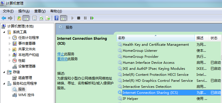 (1)启用ICS,再主计算机中, Win + R, 然后, 输入 services.msc ,打开服务对话框,或者开启方式为:我的电脑,右键,管理