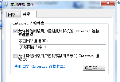 (2)设置主机上的本地链接,选择链接的无线网络,为共享链接。