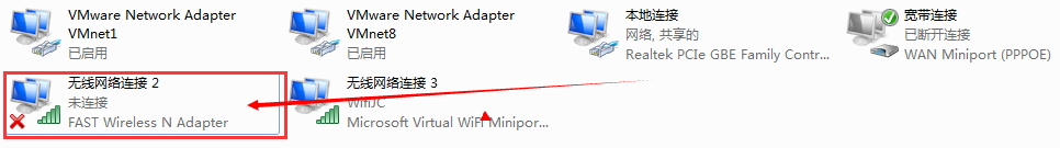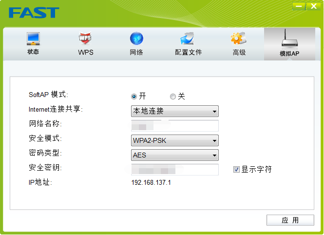 “高级”——请选择一个无线网卡:无线网络连接 FAST无线USB网卡(我的台式电脑也只有这一个网卡可以选择)。
