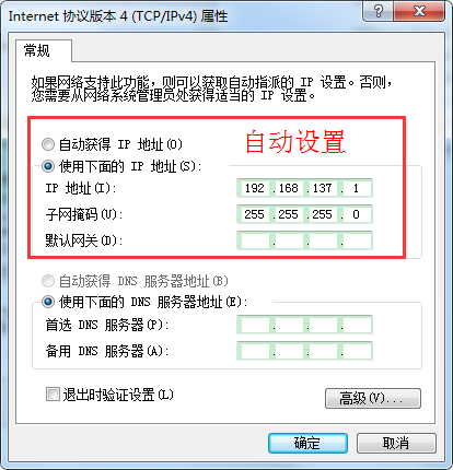(3)针对共享的计算机网卡,需要设置其“自动获得IP地址”、“自动获得DNS服务器地址”,再这里我们是使用的是“”