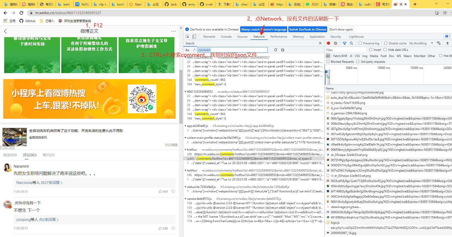 我们要爬取此网页,要找到其数据的json文件,可以直接F12,network,CTRL+F搜索comment(如果没有网络文件,就刷新一下),得到对应comment json的URL,把URL中的id进行替换。如图