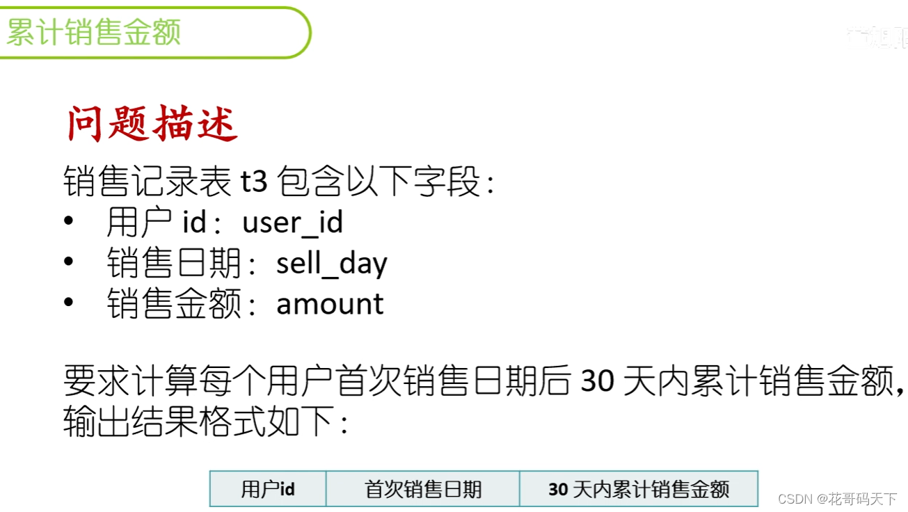 某互联网公司数据分析岗位SQL面试题,要求计算每个用户首次销售日期后 30 天内累计销售金额。