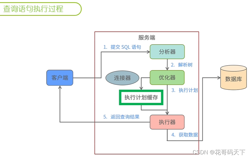 从客户端建立连接开始,到解析器进行语法、语义分析和权限检查,然后优化器生成执行计划,执行器调用存储引擎获取物理文件中的数据,最后返回客户端。同时数据库为了提高性能,还提供了查询计划缓存和热点数据缓存。