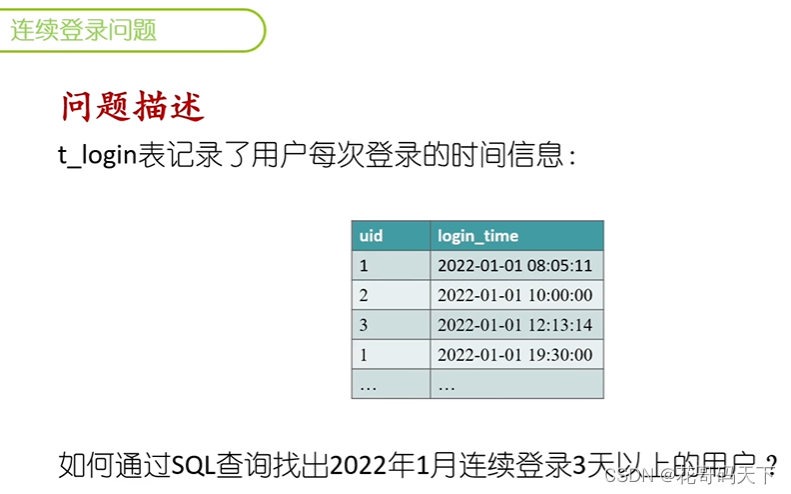 INSERT INTO t_login VALUES (2, '2022-01-07 21:00:00');-- 如何通过SQL查询找出2022年1月连续登录3天以上的用户?
