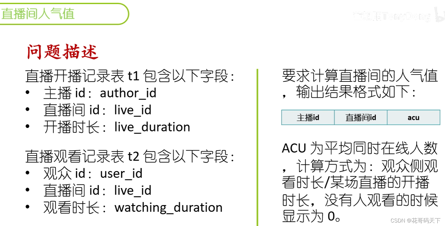 某互联网(直播带货)公司数据分析师岗位SQL面试题解析,这一题要求计算直播间人气值ACU。ACU 为平均同时在线人数(Average concurrent users),计算方式为:观众侧观看时长/某场直播的开播时长,没有人观看的时候显示为 0。