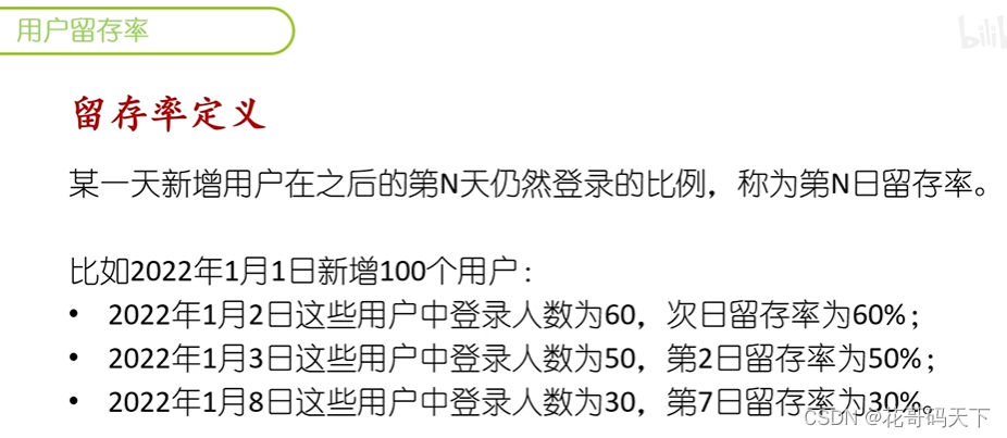 某一天新增用户在之后的第N天仍然登录的比例,称为第N日留存率。使用SQL分析留存率一般有两种方法:多表连接和窗口函数。