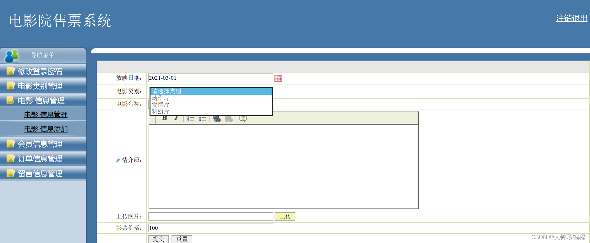 - 电影信息管理:实现对电影信息的管理添加新的上映电影、删除已有的电影、查看现在正在上映的电影。