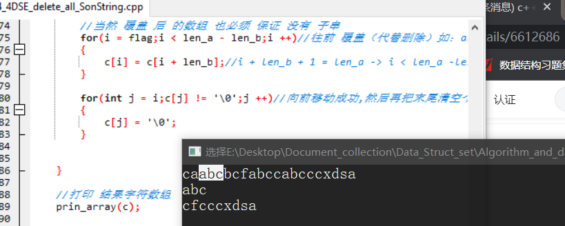 {int len_b = strlen(b);//获取 子串 长度 int flag = 0;int len_a = strlen(a);//获取 主串 长度 char c[len_a] = {0};//用来 保存 主串 的值 strcpy(c,a);//把a值 赋值在c中,给 c 便于修改 prin_array(a);prin_array(b);while(1){flag = index(c,b);if(flag == -1){break;}int i = flag;//当然 覆盖 后 的数组 也必须 保证 没有 子串 for(i = flag;i < len_a - len_b;i ++)//往前 覆盖(代替删除)如:abcdfg -> dfgdfg{c[i] = c[i + len_b];//i + len_b + 1 = len_a -> i < len_a -lenb}for(int j = i;c[j] != '\0';j ++)//向前移动成功,然后再把末尾清空个数 为子串长度 的元素:dfgdfg -> dfg'\0''\0''\0'{c[j] = '\0';}}//打印 结果字符数组prin_array(c);return;