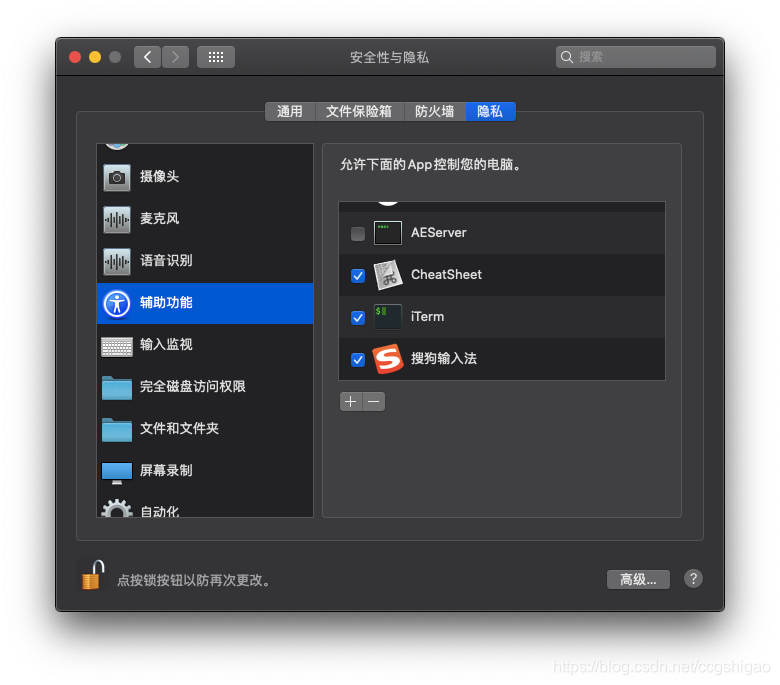 MAC左上角小苹果-[系统偏好设置]-[安全性与隐私]-[辅助功能]-CheatSheet(勾选)