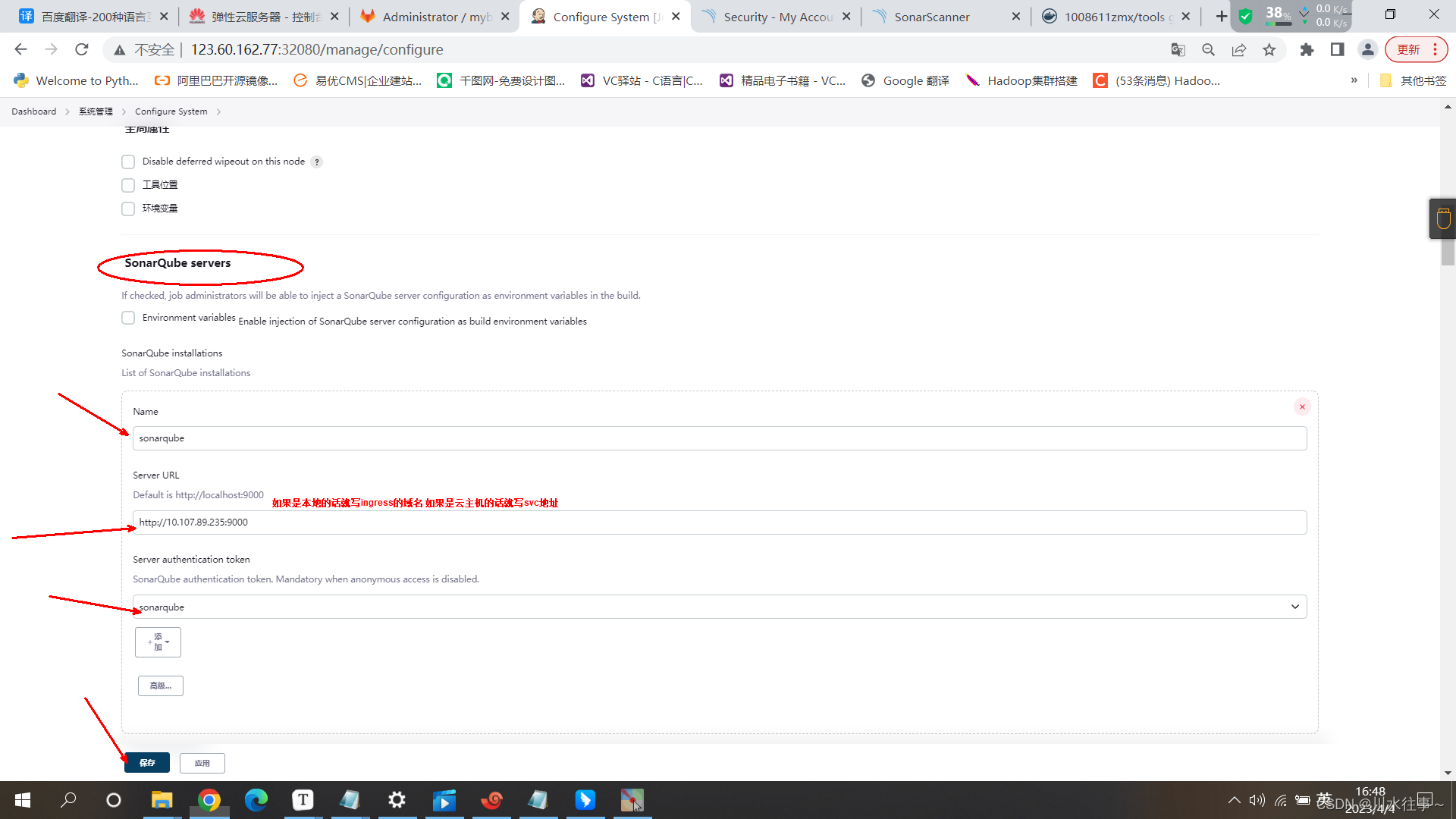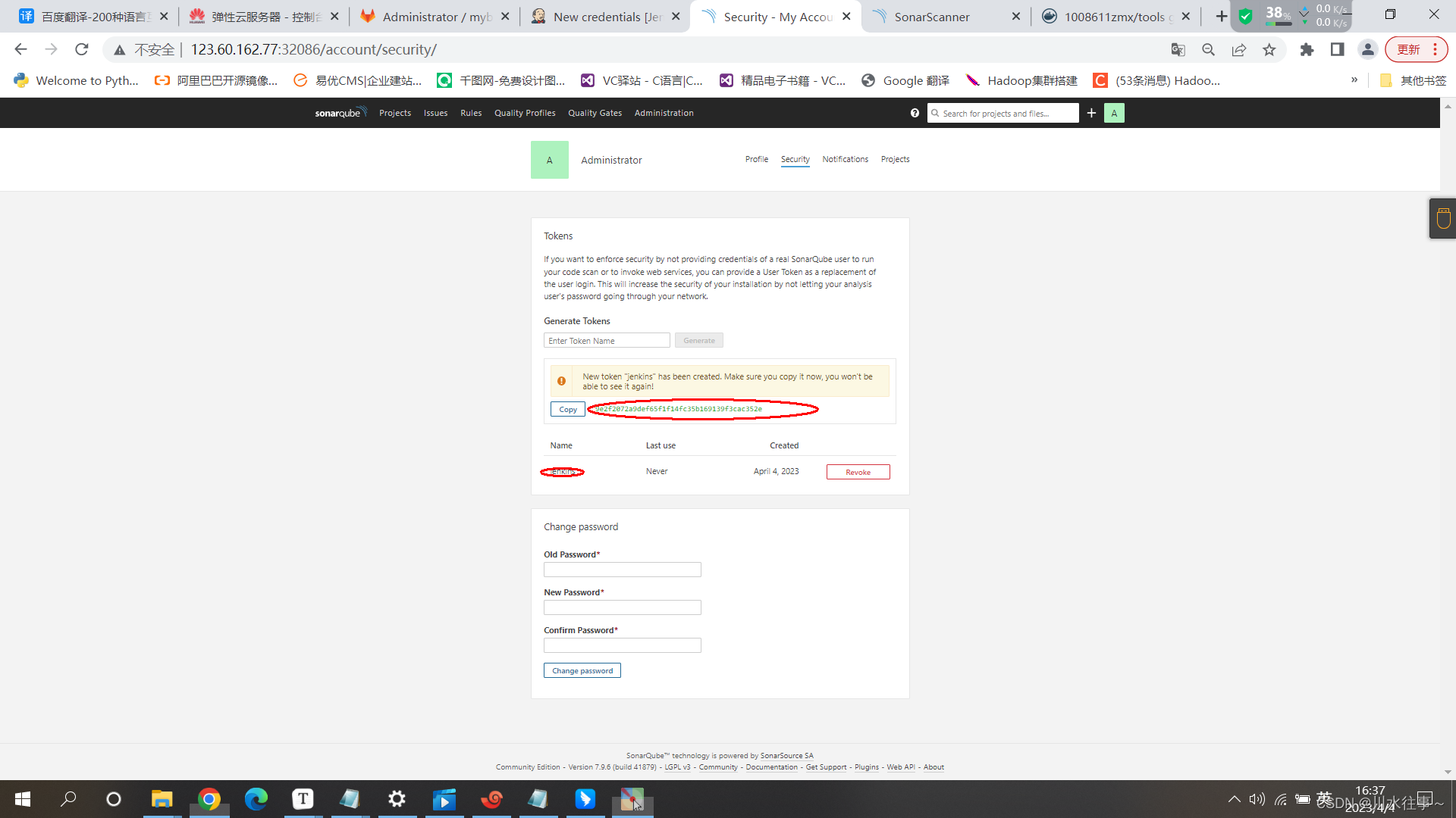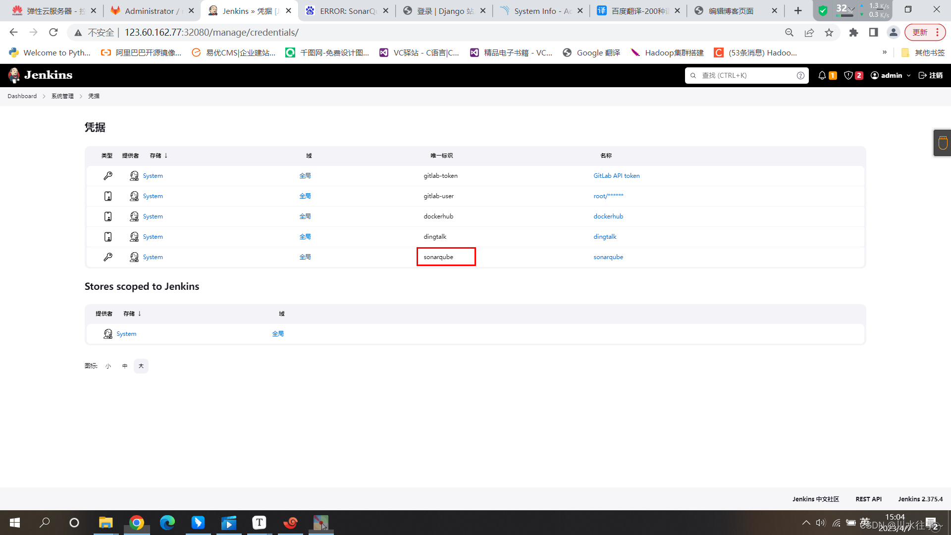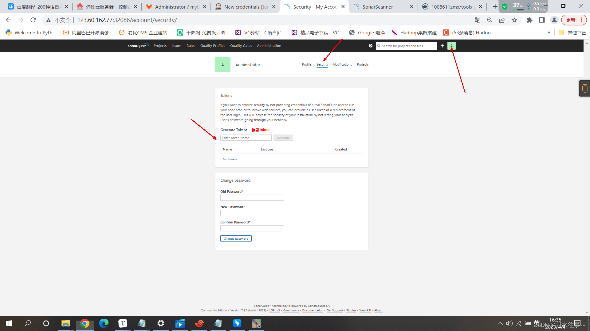 而jenkins凭证里面需要的token值需要到sonar中创建