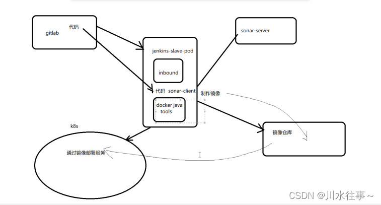 当gitlab发生了代码更新之后 代码拉到我们jenkins-slave中jenkins-slave-pod(inbound tools两个容器)我们tools容器中集成了sonar-client 将代码的扫描结果上传给了sonar-server服务端,当扫描结果通过了之后,让后用代码制作镜像,把镜像推送给镜像仓库,因为我们jenkins对接了k8s,k8s向我们的镜像仓库进行访问拉取镜像 部署服务 其中jenkins扮演了一个指挥官 调度官的角色