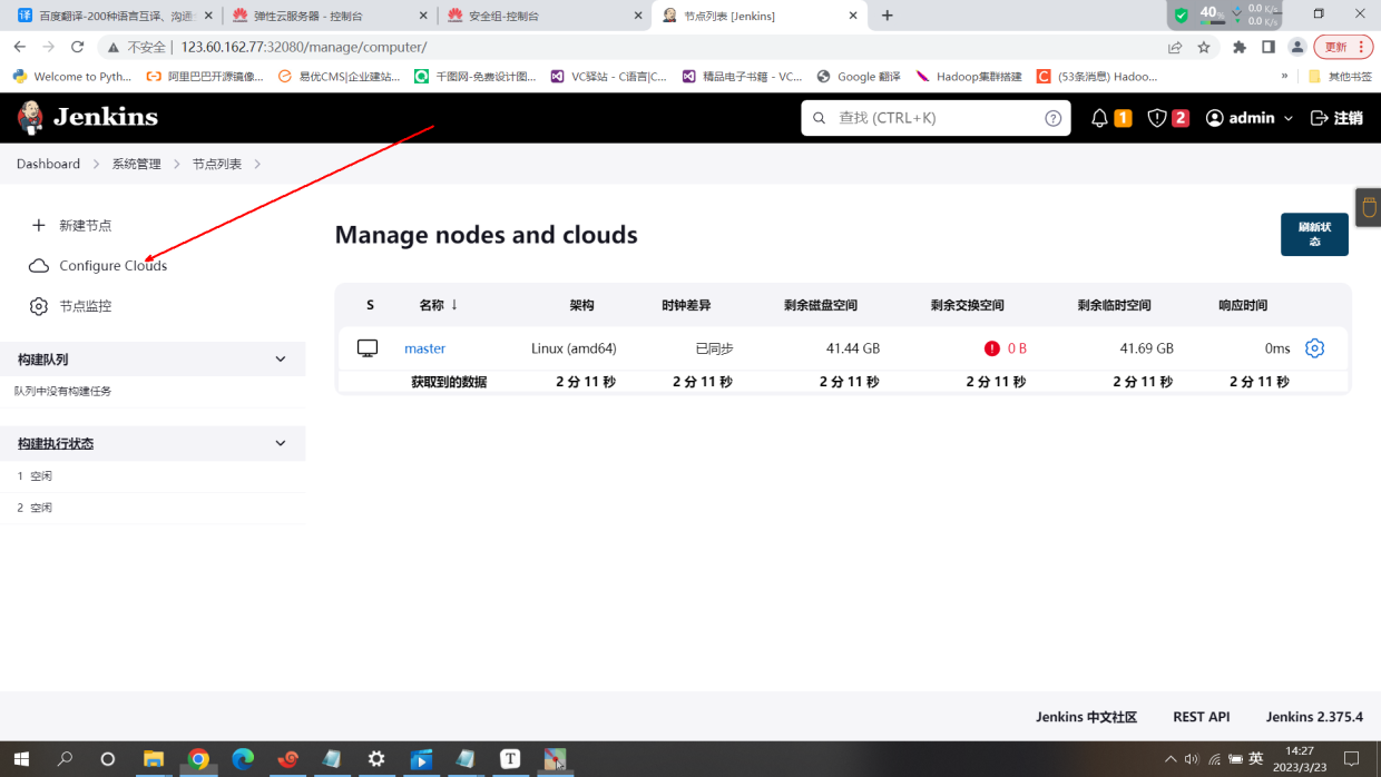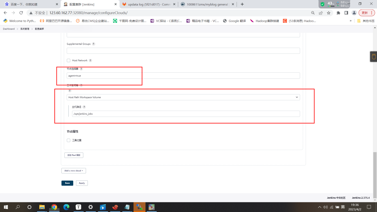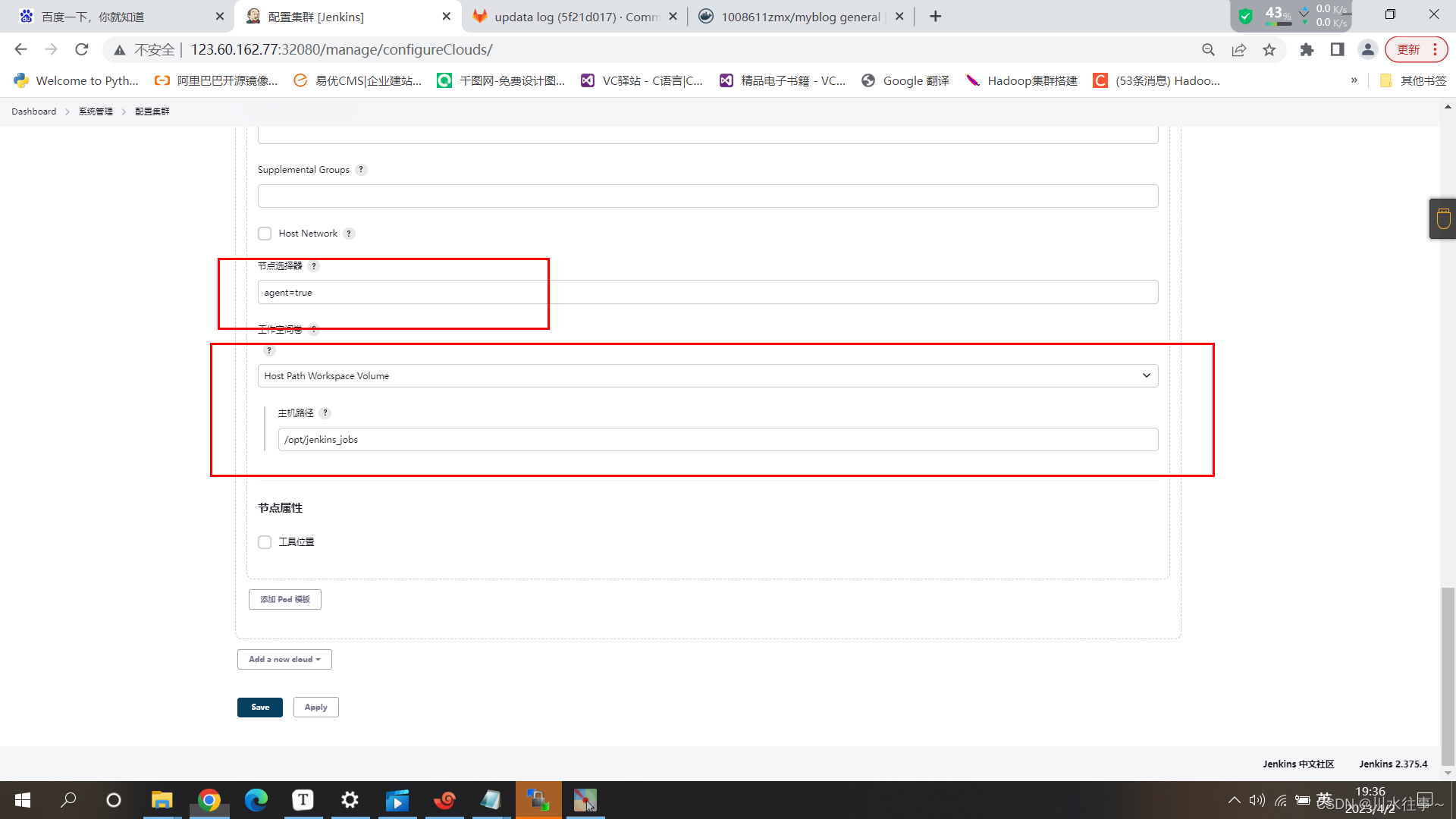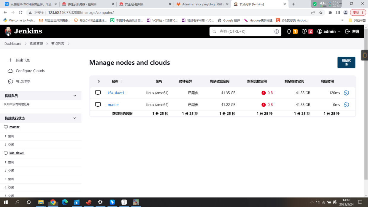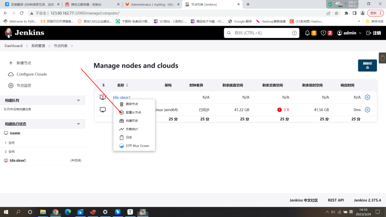 curl -sO http://123.60.162.77:32080/jnlpJars/agent.jar #因为我部署在云服务器 所以123.60.162.77:32080尽量用内网,如果是本地部署的需要在host里面写ingres地址做映射java -jar agent.jar -jnlpUrl http://123.60.162.77:32080/manage/computer/k8s%2Dslave1/jenkins-agent.jnlp -secret @secret-file -workDir "/opt/jenkins_jobs"