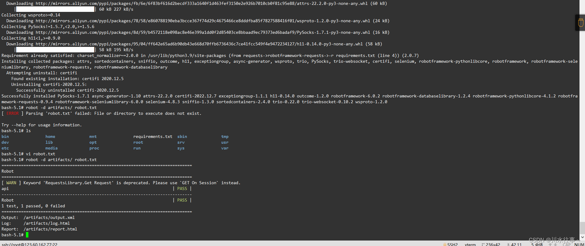 $ pip install -i http://mirrors.aliyun.com/pypi/simple/ --trusted-host mirrors.aliyun.com -r requirements.txt #使用robot命令做测试