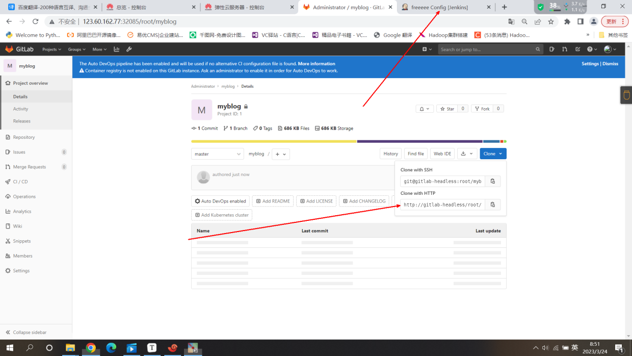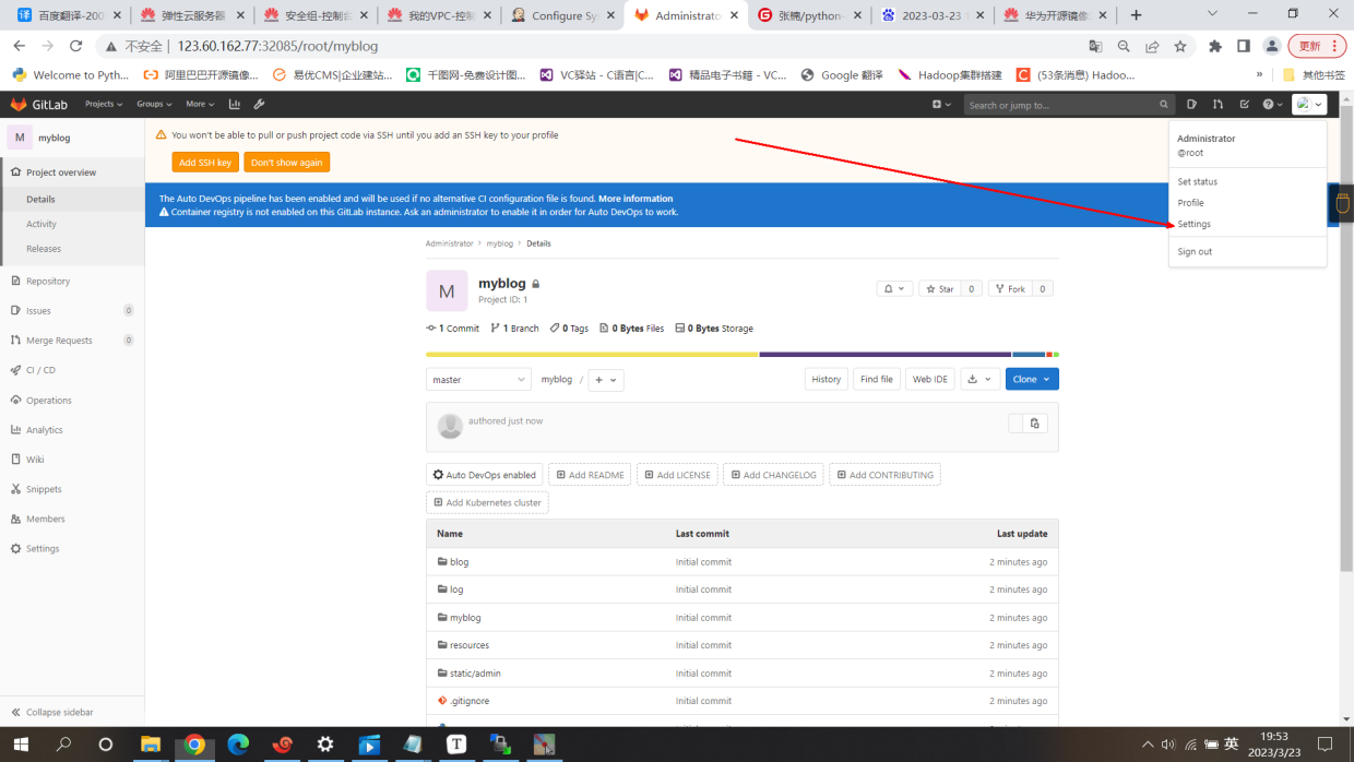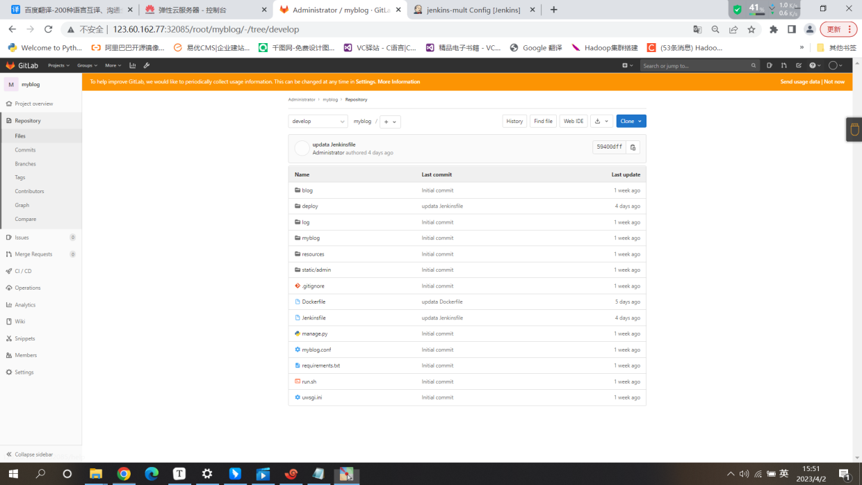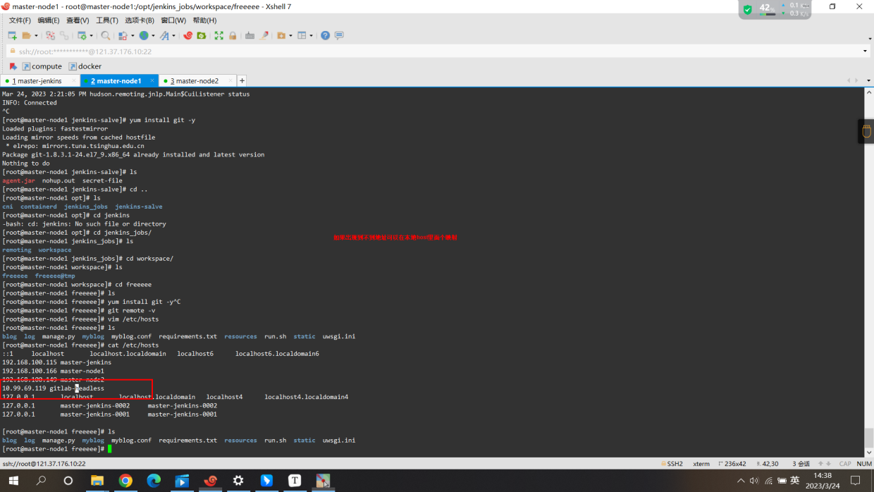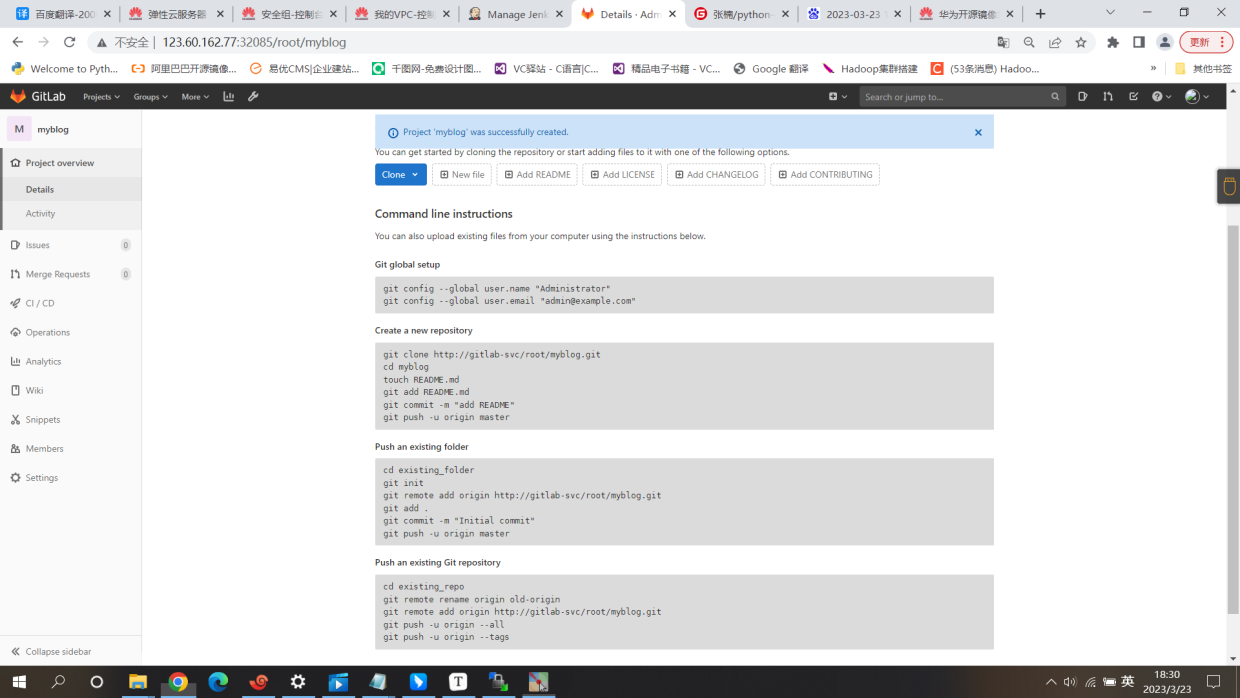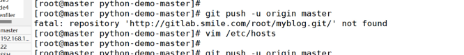 git init 代码初始化git remote add origin http://gitlab-svc/root/myblog.git 生成一个git地址 (在执行这个命令时如果出现fatal: unable to access 'http://gitlab-svc/root/myblog.git/': Could not resolve host: gitlab-svc; Unknown error需要将此命令的http://gitlab-svc/root/myblog.git修改为内部ip来使用)git remote -v 查看git地址git add .git commit -m "Initial commit" 初始化 git commit -m "updata Dockerfile(指定上传的包)"git push -u origin master #出现以下error 在host里面写指定
