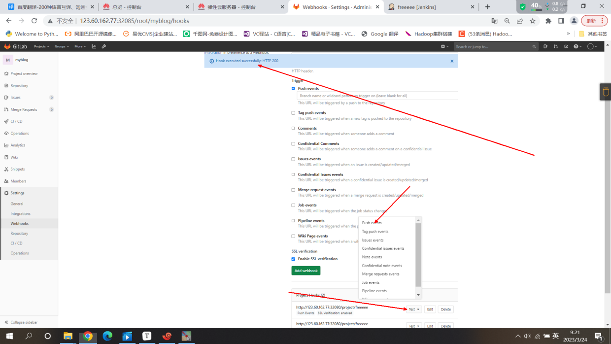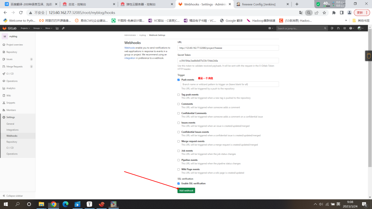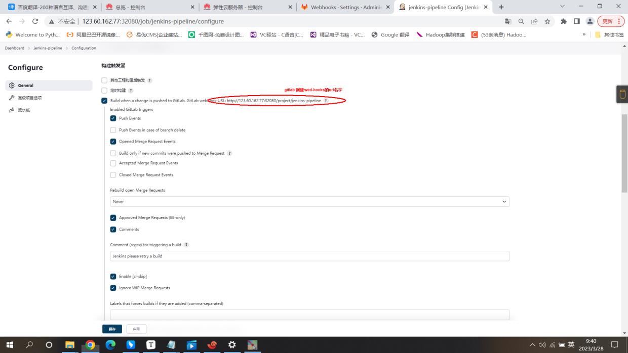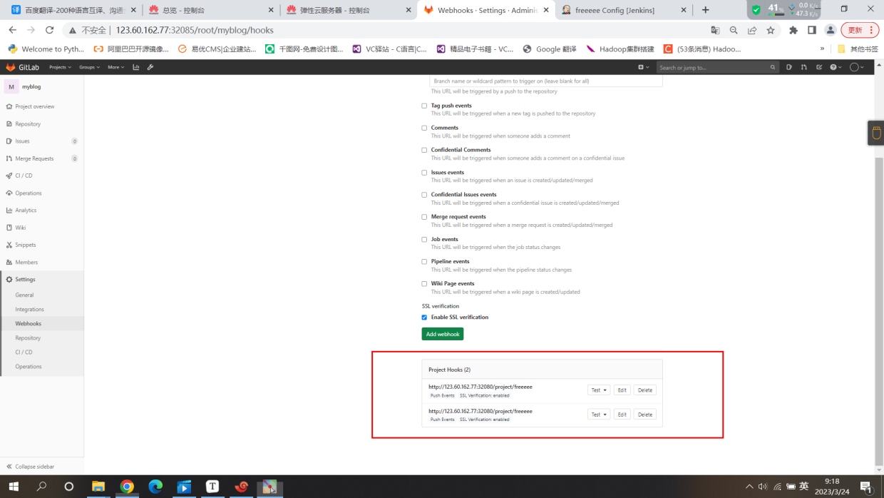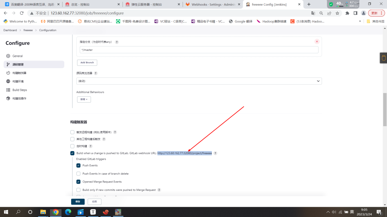点击 Build when a change is pushed to GitLab. GitLab webhook URL: http://123.60.162.77:32080/project/freeeee? #当代码发生变化的时候向gitlab进行推送 #因为地址的原因不能直接进行推送,需要配置wedhooks