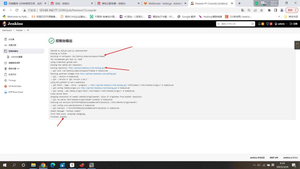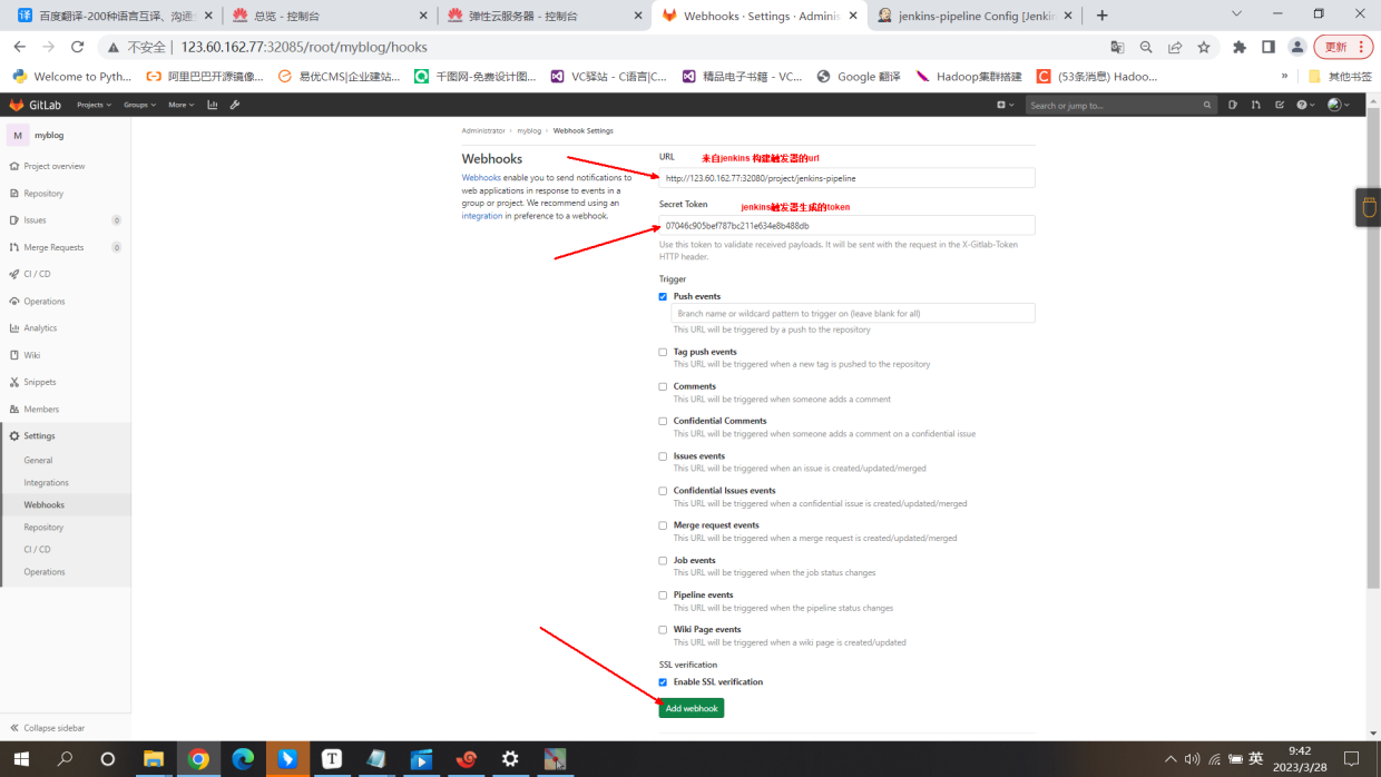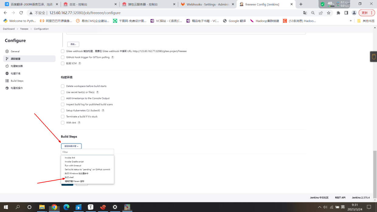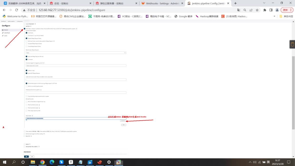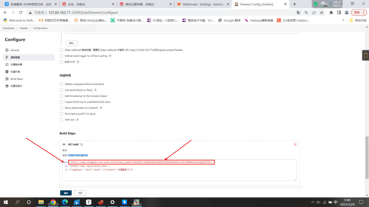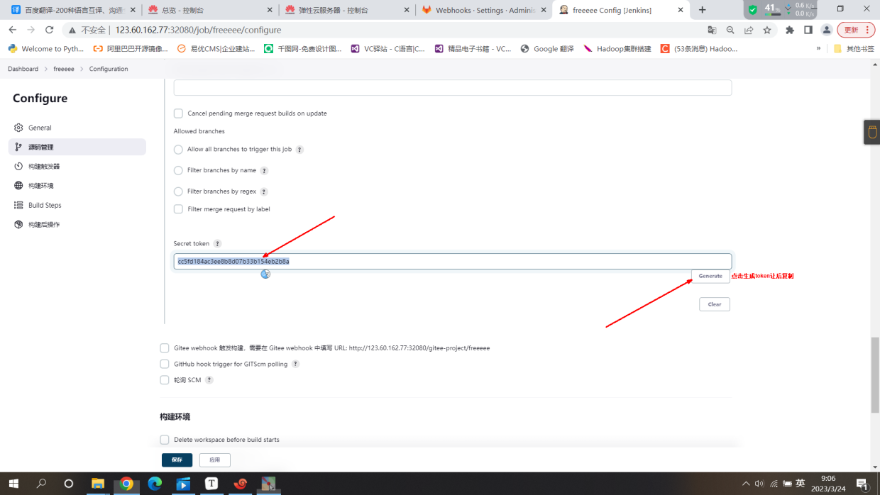 点击 Build when a change is pushed to GitLab. GitLab webhook URL: http://123.60.162.77:32080/project/freeeee? #当代码发生变化的时候向gitlab进行推送 #因为地址的原因不能直接进行推送,需要配置wedhooks