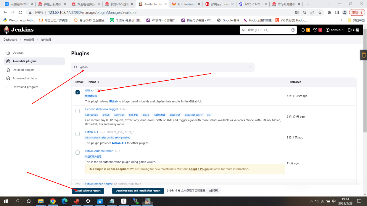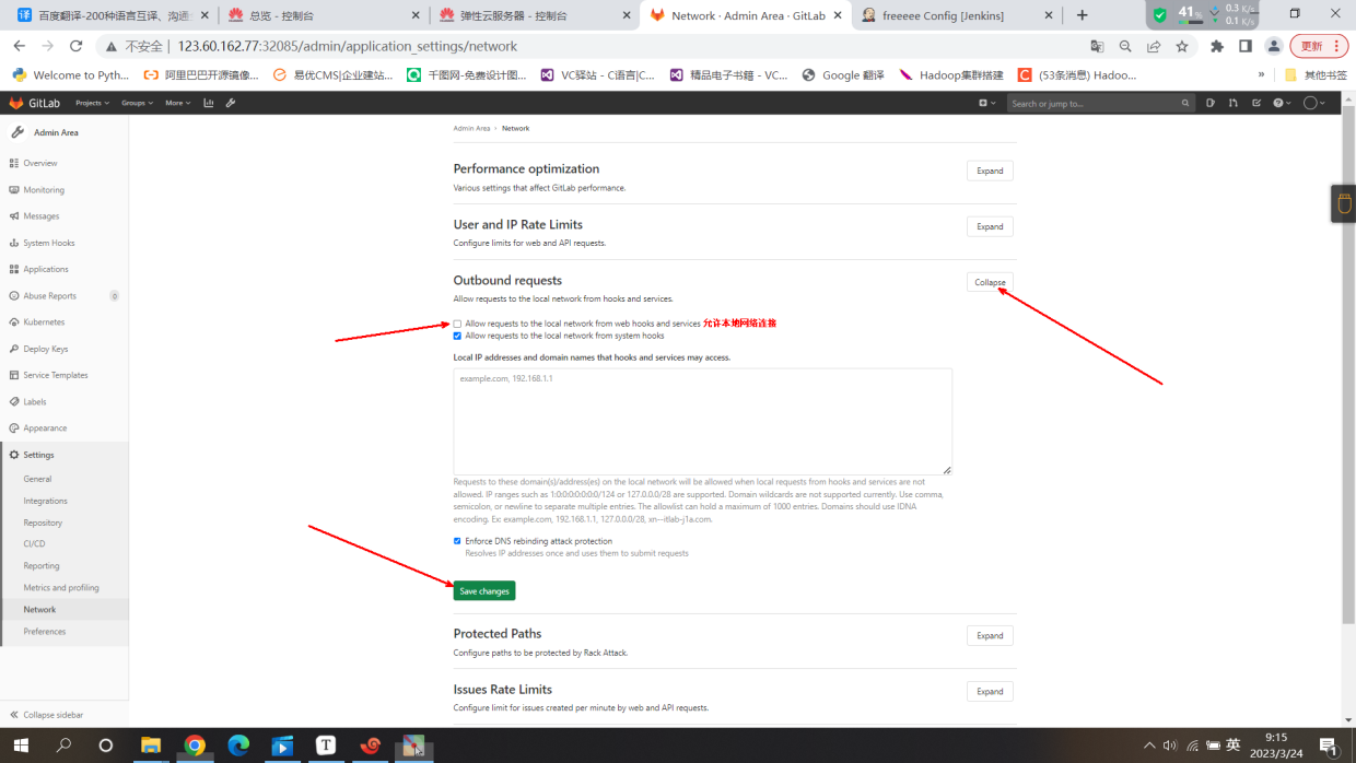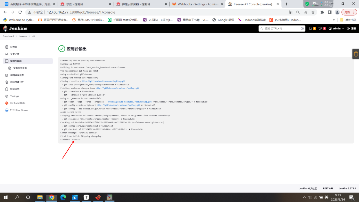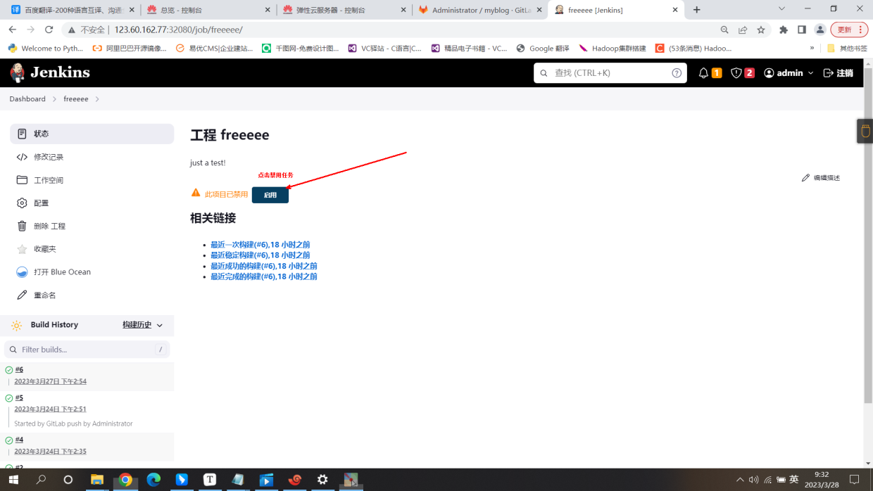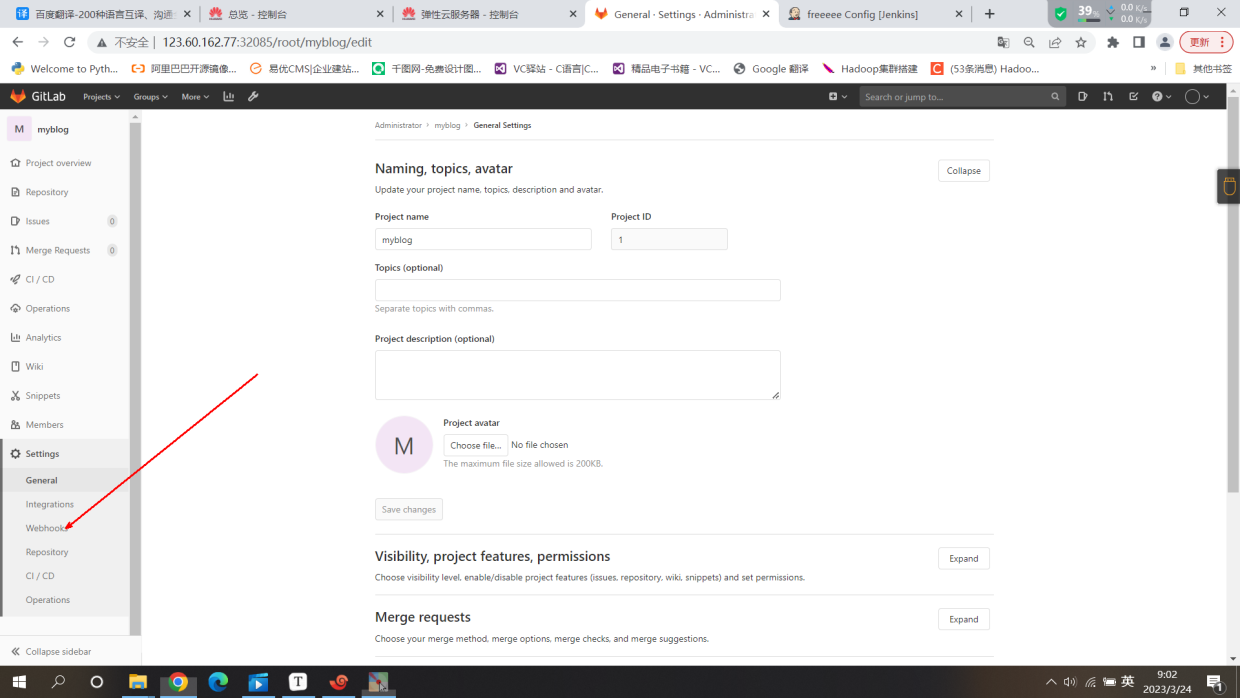 点击 Build when a change is pushed to GitLab. GitLab webhook URL: http://123.60.162.77:32080/project/freeeee? #当代码发生变化的时候向gitlab进行推送 #因为地址的原因不能直接进行推送,需要配置wedhooks