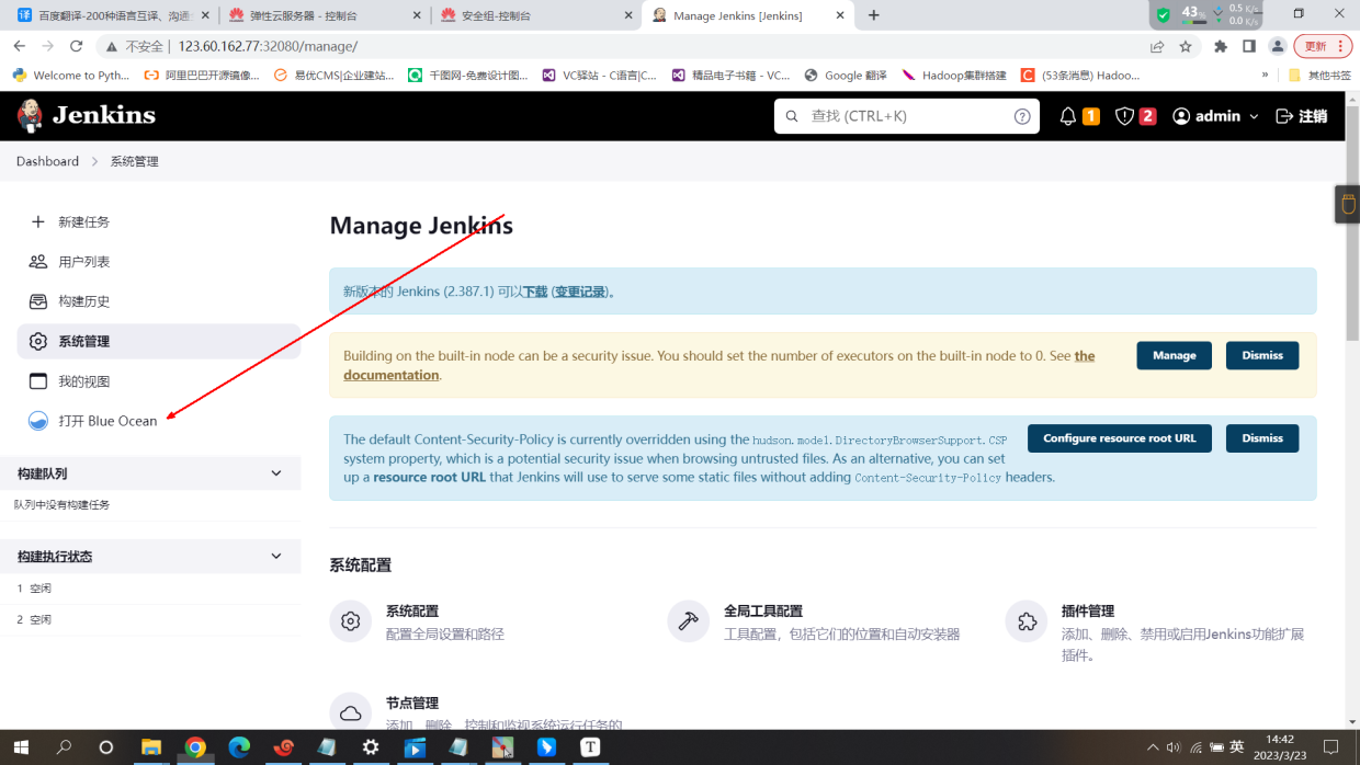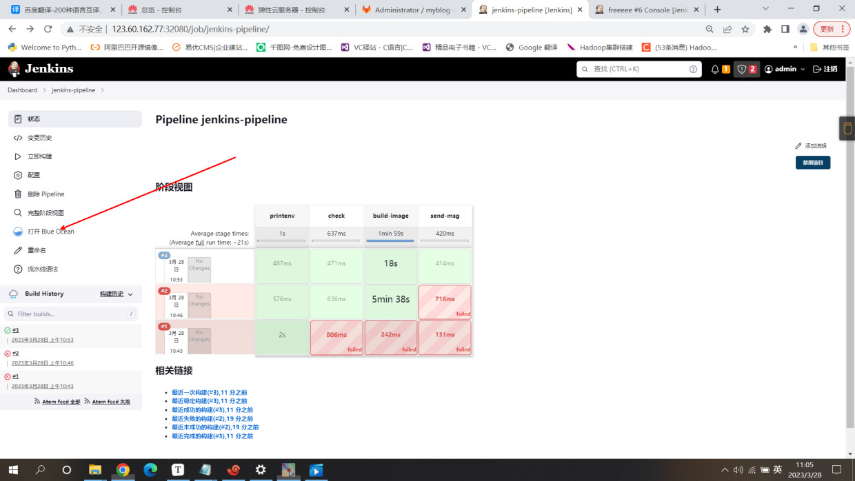 点击Manage Jenkins --》点击插件管理 --》Available plugins --》搜索blue Ocean ----》点击安装