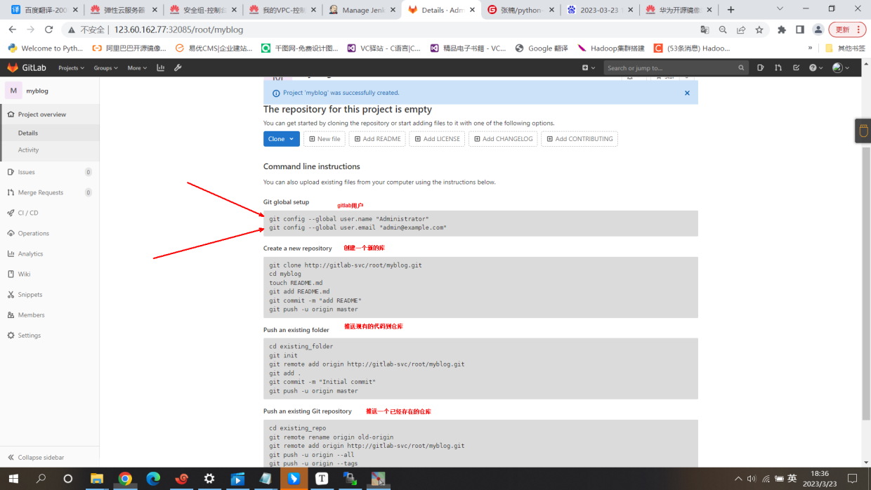 在解压出来的代码目录中执行我们部署的gitlab提供的git命令(一定要在本目录执行!!!)