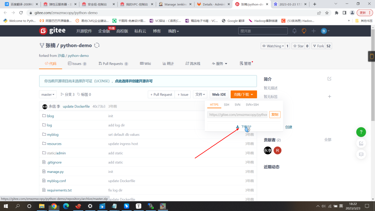 Create a new repository创建新的存储库Push an existing folder推送现有文件夹Push an existing Git repository推送现有的Git存储库根据我们的部署我们是要推送gitee下载的代码进行推送,所以使用第二个哐框里面的命令
