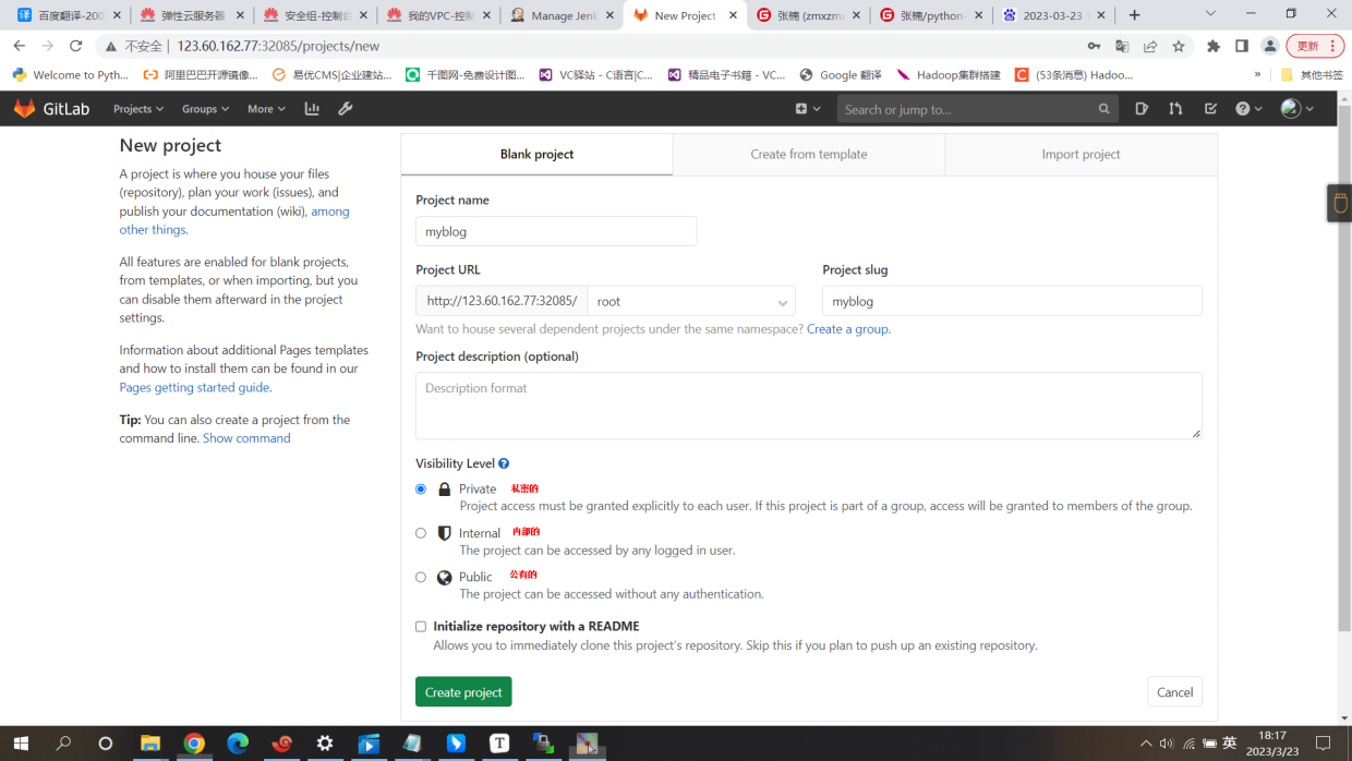部署和注册gitlab完成后点击Create a project创建一个仓库