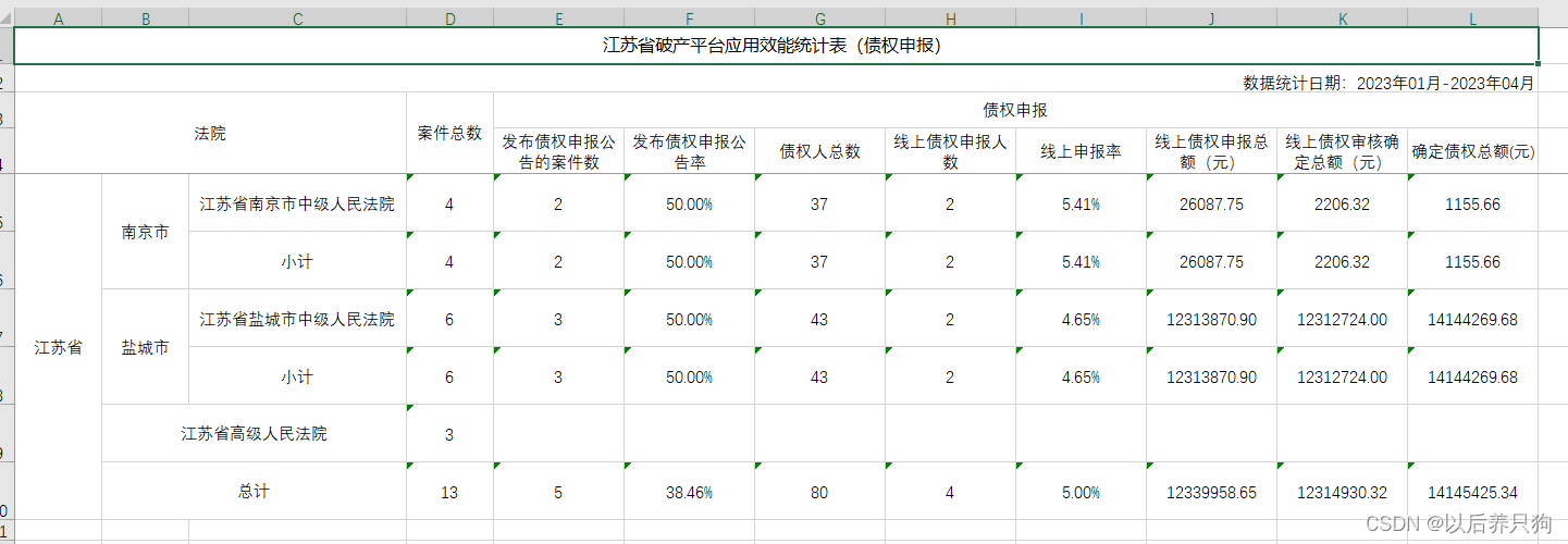 public class CreditorStaticsVo{private static final String title = "债权申报";/*** 法院*/@Excel(name = "法院", orderNum = "0",mergeVertical = true,height = 16)private String province;/****/@Excel(name = "市", orderNum = "1",mergeVertical = true)private String city;/*** 法院*/@Excel(name = "法院", orderNum = "2",mergeVertical = true,width = 25)private String fymc;/*** 案件总数*/@Excel(name = "案件总数", orderNum = "3")private Integer caseTotal;/*** 发布债权申报公告的案件数*/@Excel(name = "发布债权申报公告的案件数", orderNum = "4",width = 15,groupName = title)private Integer noticeTotal;/*** 发布债权申报公告率*/private BigDecimal noticeRate;@Excel(name = "发布债权申报公告率", orderNum = "5",width = 15,groupName = title)private String noticeRateStr;/*** 债权人总数*/@Excel(name = "债权人总数", orderNum = "6",width = 15,groupName = title)private Integer creditorTotal;/*** 线上债权申报人数*/@Excel(name = "线上债权申报人数", orderNum = "7",width = 15,groupName = title)private Integer applyPassTotal;/*** 线上申报率*/private BigDecimal applyRate;@Excel(name = "线上申报率", orderNum = "8",width = 15,groupName = title)private String applyRateStr;/*** 线上债权申报总额(元)*/@Excel(name = "线上债权申报总额(元)", orderNum = "9",width = 15,groupName = title)private BigDecimal applyAmount;/*** 线上债权审核确定总额(元)*/@Excel(name = "线上债权审核确定总额(元)", orderNum = "10",width = 15,groupName = title)private BigDecimal confirmAmount;/*** 确定债权总额(元)*/@Excel(name = "确定债权总额(元)", orderNum = "11",width = 15,groupName = title)private BigDecimal creditorAmount;}