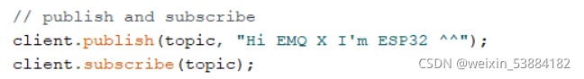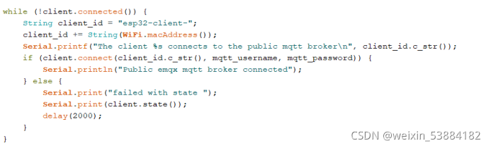 PubSubClient client(espClient);void setup() {Serial.begin(115200);WiFi.begin(ssid,psw);while(WiFi.status()!=WL_CONNECTED){ //未连接上delay(500);Serial.println("connect to wifi...");}Serial.println("successfully connected"); client.setServer(mqtt_broker, mqtt_port);while (!client.connected()) {String client_id = "esp32-client-";client_id += String(WiFi.macAddress());Serial.printf("The client %s connects to the public mqtt broker\n", client_id.c_str());if (client.connect(client_id.c_str(), mqtt_username, mqtt_password)) {Serial.println("Public emqx mqtt broker connected");} else {Serial.print("failed with state ");Serial.print(client.state());delay(2000);}}// publish and subscribeclient.publish(topic, "Hi EMQ X I'm ESP32 ^^");client.subscribe(topic);