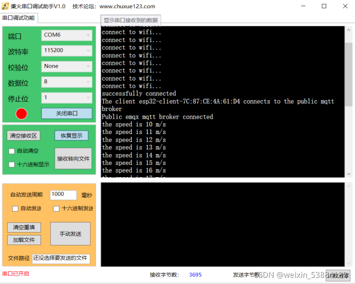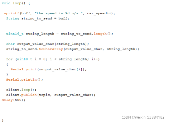 }void loop() {sprintf(buff, "the speed is %d m/s.", car_speed++);String string_to_send = buff;uint16_t string_length = string_to_send.length();char output_value_char[string_length];string_to_send.toCharArray(output_value_char, string_length);for (uint8_t i = 0; i < string_length; i++){Serial.print(output_value_char[i]);}Serial.println();client.loop();client.publish(topic, output_value_char);