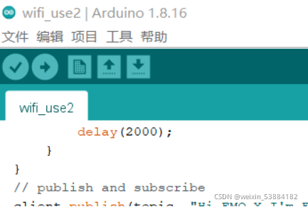 Loop函数 其实是一个一直运行的循环函数,我们需要的数据传输在这里进行,其实在测试样例中我们只需要一个client.publish(),但在这之前需要对其后一个参数进行类型转换,char*与string类都不行。