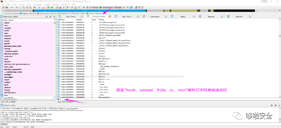 搜索"hook、xposed、frida、su、root、/system/"等特征字符串快速定位