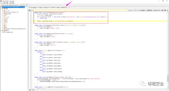 搜索root检测特征、逻辑,其中Hook(如:Xposed、Frida等)检测的字符串特征类似,可以通过jadx、JEB3等反编译工具快速搜索定位到检测关键点