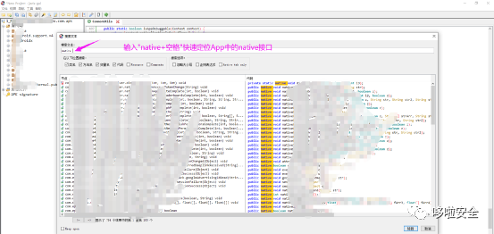 在jadx的搜索文本中,输入”native+空格”快速定位App中的native接口,分析是否存在Root、Hook、模拟器环境、云手机环境、App风险环境等相关检测