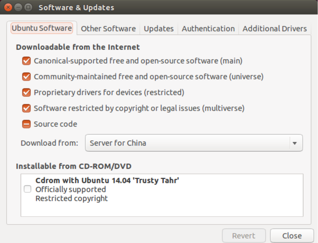 4.进入“系统设置”,配置Ubuntu仓库,如果看到界面如下图,即该勾选的选项都勾选上了,那么就可以下一步了。否则,勾选以后,按照提示重新进行一次