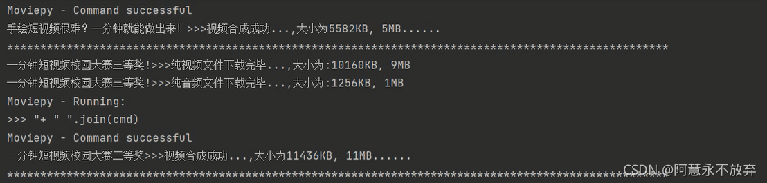 for i in range (len(list2)):url = list2[i]# headers_ = {headers__ = {'User-Agent': 'Mozilla/5.0 (Windows NT 10.0; Win64; x64) AppleWebKit/537.36 (KHTML, like Gecko) Chrome/86.0.4240.111 Safari/537.36','Cookie': "INTVER=1; _uuid=09E58359-9210-BAEE-1A60-4EE46A2B82C655513infoc; sid=5ytmp0pi; LIVE_BUVID=AUTO6515760552512495; stardustvideo=1; laboratory=1-1; rpdid=|(umuum~uku|0J'ul~Y|llkl); buvid3=684E90B9-B796-4512-AE61-CED715ED0D2B53931infoc; stardustpgcv=0606; finger=158939783; DedeUserID=246639322; DedeUserID__ckMd5=0de51babcf36bfe1; SESSDATA=0453e7c3%2C1613286482%2C848b7*81; bili_jct=05a501d5099630a42cb271cebdbc3470; blackside_state=1; CURRENT_FNVAL=80; CURRENT_QUALITY=80; bsource=search_baidu; PVID=4"}# # 发送请求,得到响应对象response_ = requests.get(url, headers=headers__)str_data = response_.text # 视频主页的html代码,类型是字符串# 使用xpath解析html代码,,得到想要的urlhtml_obj = etree.HTML(str_data) # 转换格式类型# 获取视频的名称res_ = html_obj.xpath('//title/text()')[0] ## 视频名称的获取title_ = re.findall(r'(.*?)_哔哩哔哩', res_)[0]# 影响视频合成的特殊字符的处理title_ = title_.replace('/', '')title_ = title_.replace('-', '')title_ = title_.replace('|', '')title_ = title_.replace(' ', '')title_ = title_.replace('&', '')# 使用xpath语法获取数据,取到数据为列表,索引[0]取值取出里面的字符串,即包含视频音频文件的url字符串url_list_str = html_obj.xpath('//script[contains(text(),"window.__playinfo__")]/text()')[0]# 纯视频的urlvideo_url = re.findall(r'"video":\[{"id":\d+,"baseUrl":"(.*?)"', url_list_str)[0]# 纯音频的urlaudio_url = re.findall(r'"audio":\[{"id":\d+,"baseUrl":"(.*?)"', url_list_str)[0]# 设置跳转字段的headersheaders_ = {'User-Agent': 'Mozilla/5.0 (Windows NT 10.0; Win64; x64) AppleWebKit/537.36 (KHTML, like Gecko) Chrome/86.0.4240.111 Safari/537.36','Referer': url_}# 获取纯视频的数据response_video = requests.get(video_url, headers=headers_, stream=True)bytes_video = response_video.content# 获取纯音频的数据response_audio = requests.get(audio_url, headers=headers_, stream=True)bytes_audio = response_audio.content# 获取文件大小, 单位为KBvideo_size = int(int(response_video.headers['content-length']) / 1024)audio_size = int(int(response_audio.headers['content-length']) / 1024)# 保存纯视频的文件title_1 = title_ + '!' # 名称进行修改,避免重名with open(f'{title_1}.mp4', 'wb') as f:f.write(bytes_video)print(f'{title_1}>>>纯视频文件下载完毕...,大小为:{video_size}KB, {int(video_size/1024)}MB')with open(f'{title_1}.mp3', 'wb') as f:f.write(bytes_audio)print(f'{title_1}>>>纯音频文件下载完毕...,大小为:{audio_size}KB, {int(audio_size/1024)}MB')ffmpeg_tools.ffmpeg_merge_video_audio(f'{title_1}.mp4', f'{title_1}.mp3', f'{title_}.mp4')# 显示合成文件的大小res_ = int(os.stat(f'{title_}.mp4').st_size / 1024)print(f'{title_}>>>视频合成成功...,大小为{res_}KB, {int(res_/1024)}MB......')# 移除纯视频文件,os.remove(f'{title_1}.mp4')# 移除纯音频文件,os.remove(f'{title_1}.mp3')# 手动降低请求频率,,避免被反爬# time.sleep(3)# 隔开每一个视频的信息print('*' * 100)print('视频全部抓取完毕......')