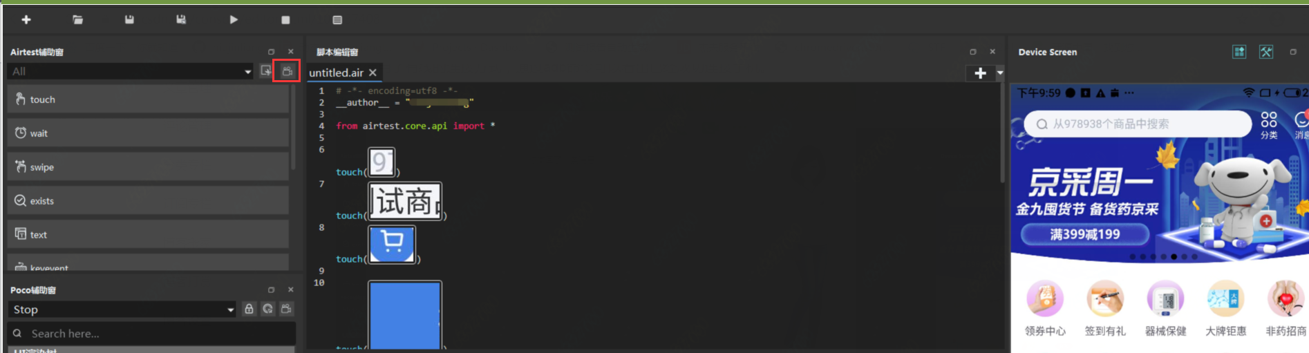 编写脚本有两种方式,一种是通过左侧的辅助框,点击左侧辅助框后,在右侧手机屏幕上画出点击的框,每一步骤都是如此,借住左侧的动作。
