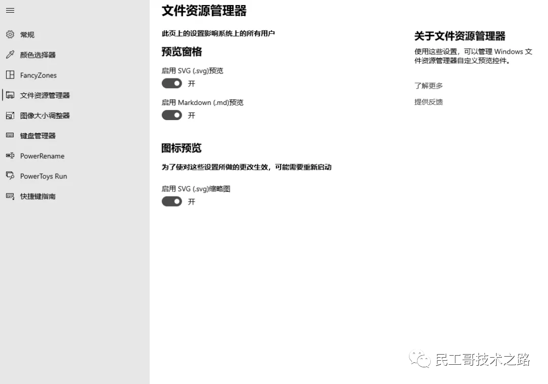 文件资源管理器是一个预览窗口的增强插件,当前的版本主要是在默认格式的基础上,增加支持了.svg图像格式以及.md文件格式的预览查看,目前来说这个功能对我们普通用户的意义不大,不过微软微软希望通过PowerToys扩展文件资源管理器的预览窗格,并在将来添加对其他文件类型的支持。
