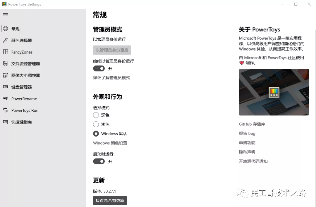 最新版本的PowerToys默认支持中文,不再是全英文界面,小编介绍起来也更方便了。第一个「常规」页面就是小工具的设置界面,可以在里面选择皮肤外观以及跟随开机启动等选项,为了后面的功能正常使用,小编建议先点击「以管理员身份重启」来以管理员身份启动软件。