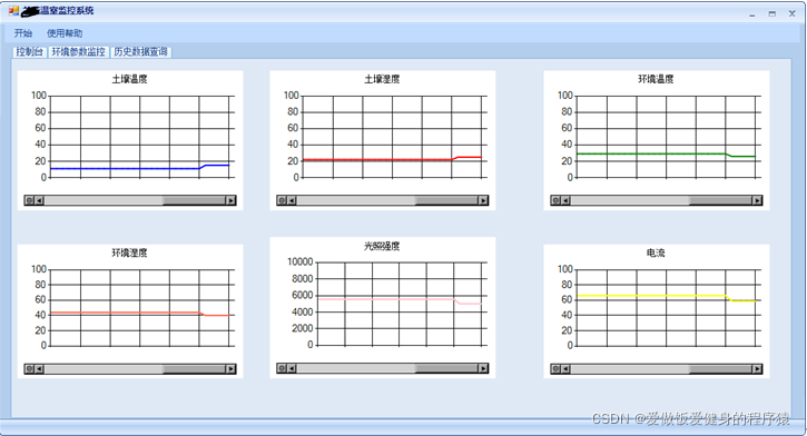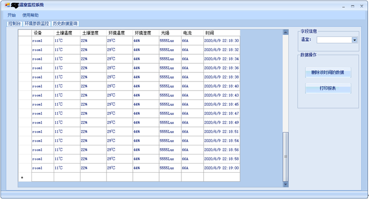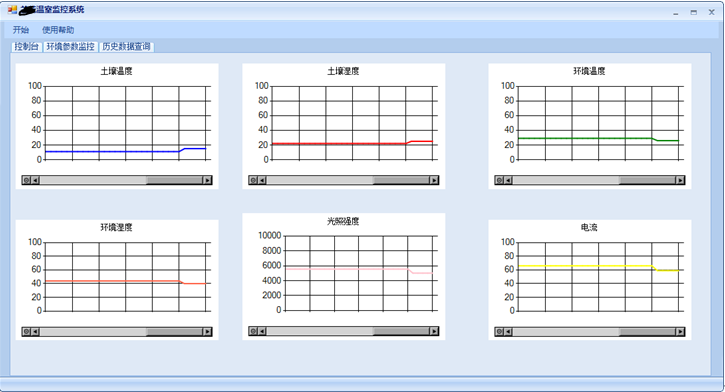 数据显示模块包含数据实时显示部分和图表显示部分,实时显示即在极短时间内系统对终端传送的数据及时接收并显示,图表显示则对接收的数据在坐标系上进行打点,生动直观的呈现给用户。上位机与终端进行连接通信后,终端将采集到的温度、湿度、光照强度等参数上传至上位机,上位机将实时接收到的数据显示在图表曲线的最右边,随着数据的不断更新,图表曲线随之动态左移。