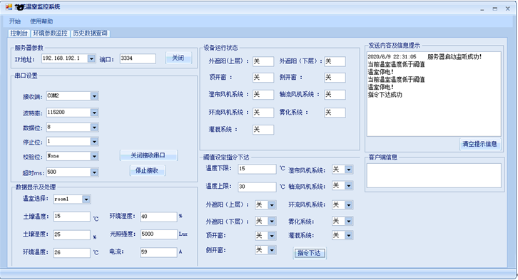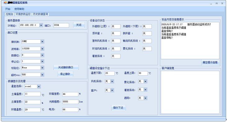 lbOnline.Items.Remove(sokClient.RemoteEndPoint.ToString());break;}string strMsg = System.Text.Encoding.UTF8.GetString(arrMsgRec, 0, length); strMsg = strMsg + "\n";Doupdate(strMsg);}}void ShowMsg(string str) {richTextBox2.AppendText(str + "\r\n");}void send(){string strMsg = mystring1.ToString();byte[] arrMsg = System.Text.Encoding.UTF8.GetBytes(strMsg); foreach (Socket s in dict.Values){s.Send(arrMsg);}}private void GetMess(){while (true){string result3 = portstring; double[][] Five_data = new double[1][]; Five_data[0] = new double[7];string[] TimeStamp = new string[1]; mystring1 = result3 + "\n";string Tu_wendu= result3.Substring(1, 2);string Tu_shidu = result3.Substring(3, 2);string Huan_wendu = result3.Substring(5, 2);string Huan_shidu = result3.Substring(7, 2);string Guangqiang = result3.Substring(9, 4);string Dianliu = result3.Substring(13, 2);waizheyang_state = result3.Substring(15, 1);neizheyang_state = result3.Substring(16, 1);dingkaichuang_state = result3.Substring(17, 1);cekaichuang_state = result3.Substring(18, 1);shilian_state = result3.Substring(19, 1);zhouliufengji_state = result3.Substring(20, 1);huanliufengji_state = result3.Substring(21, 1);wuhua_state = result3.Substring(22, 1);guangai_state = result3.Substring(23, 1);send();this.turangwendu.Text = Tu_wendu;this.turangshidu.Text = Tu_shidu;this.huanjingwendu.Text = Huan_wendu; this.huanjingshidu.Text = Huan_shidu; this.guangqiang.Text = Guangqiang; this.huoerdianliu.Text = Dianliu; UpdateQueueValue(); int inttuwendu = int.Parse(Tu_wendu);int inttushidu = int.Parse(Tu_shidu);int inthuanwendu = int.Parse(Huan_wendu);int inthuanshidu = int.Parse(Huan_shidu);int intguangqiang = int.Parse(Guangqiang);int intdianliu = int.Parse(Dianliu);AddPoint(charttuwen, inttuwendu);AddPoint(charttushi, inttushidu);AddPoint(charthuanwen, inthuanwendu);AddPoint(charthuanshi, inthuanshidu);AddPoint(chartguangqiang, intguangqiang);AddPoint(chartdianliu, intdianliu);yuzhiwenduxia = Yuzhi_xia_wendu.Text.ToString().Trim();yuzhiwendushang = Yuzhi_shang_wendu.Text.ToString().Trim();if (inthuanwendu< int.Parse(yuzhiwenduxia)){richTextBox2.AppendText("当前温室温度低于阈值\r\n");}if (inthuanwendu > int.Parse(yuzhiwendushang)){richTextBox2.AppendText("当前温室温度高于阈值\r\n");}if (intdianliu==0){richTextBox2.AppendText("温室停电!\r\n");}string shebeihao="0";if (ID.Text.ToString().Trim()!=null)shebeihao= ID.Text.ToString().Trim();string sqltuwendu = Tu_wendu + "℃";string sqltushidu = Tu_shidu + "%";string sqlhuanwendu = Huan_wendu + "℃";string sqlhuanshidu = Huan_shidu + "%";string sqlquangqiang = Guangqiang + "Lux";string sqldianliu = Dianliu + "A";string shijian = System.DateTime.Now.ToString();AddRecord(shebeihao, sqltuwendu, sqltushidu, sqlhuanwendu, sqlhuanshidu, sqlquangqiang, sqldianliu, shijian);DispDatabase();Thread.Sleep(2000);}}private void button1_Click(object sender, EventArgs e){string shijian = System.DateTime.Now.ToString();socketWatch = new Socket(AddressFamily.InterNetwork, SocketType.Stream, ProtocolType.Tcp);IPAddress address = IPAddress.Parse(cbLocalIP.Text.Trim());IPEndPoint endPoint = new IPEndPoint(address, int.Parse(COM.Text.Trim()));String sqlStr = "server='.\\SQLy';" +"database='Enmo';" +"uid='sa';" +"pwd='123456';";sqlConnection = new SqlConnection(sqlStr);sqlConnection.Open();ClearRecord();DispDatabase();try{socketWatch.Bind(endPoint);}catch (SocketException se){MessageBox.Show("异常:" + se.Message);return;}socketWatch.Listen(10);threadWatch = new Thread(WatchConnecting);threadWatch.IsBackground = true;threadWatch.Start();getmess = new Thread(GetMess);getmess.IsBackground = true;getmess.Start();ShowMsg(shijian + " 服务器启动监听成功!");button1.Text = "关闭";}private void 退出ToolStripMenuItem_Click(object sender, EventArgs e){sqlConnection.Close();sqlConnection.Dispose();this.Close();}private void 重启ToolStripMenuItem_Click(object sender, EventArgs e){if (MessageBox.Show("要重新启动吗?", "提示", MessageBoxButtons.YesNoCancel,MessageBoxIcon.Question) == DialogResult.Yes)